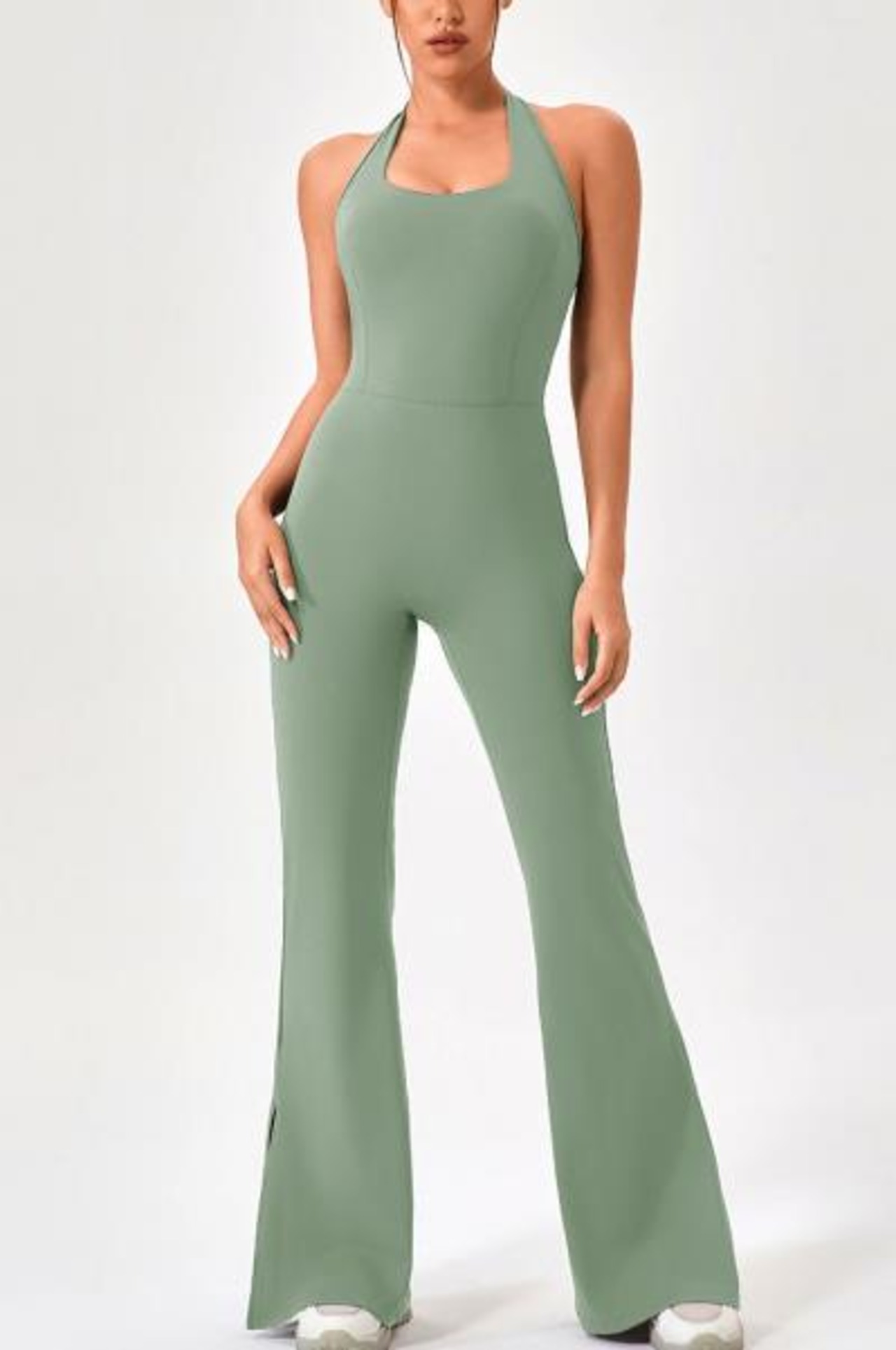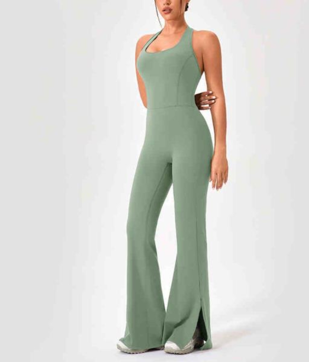 ノースリーブのタンクトップデザインと、ハイウエスト・フレアシルエットが足長効果・美脚効果を演出します。