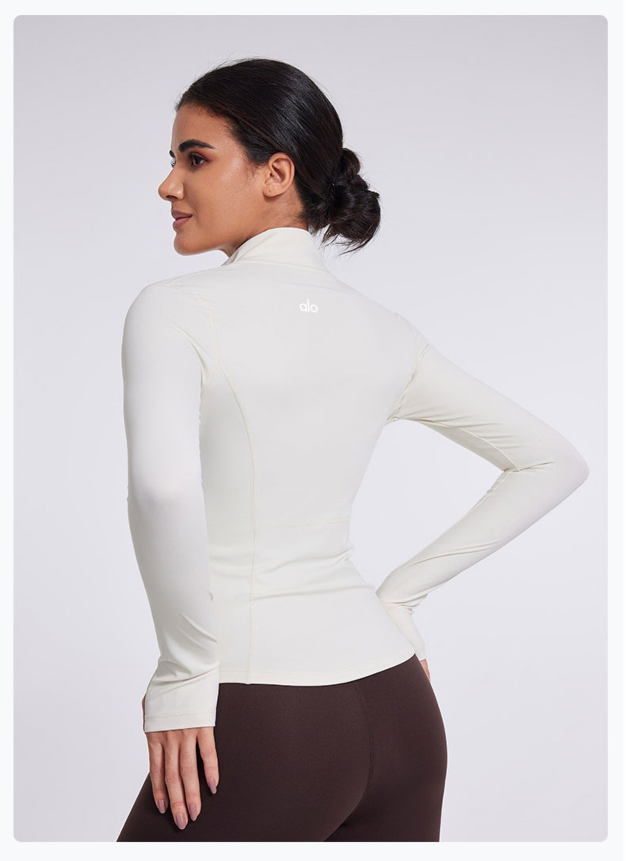 ジップアップ仕様で、気温やシーンに応じて調整が可能。さらに、親指ホール付きの袖デザインが手元の動きをサポートし、冷え対策にも。シンプルながらも洗練されたデザインで、スポーツシーンだけでなく普段使いにもぴったりです。