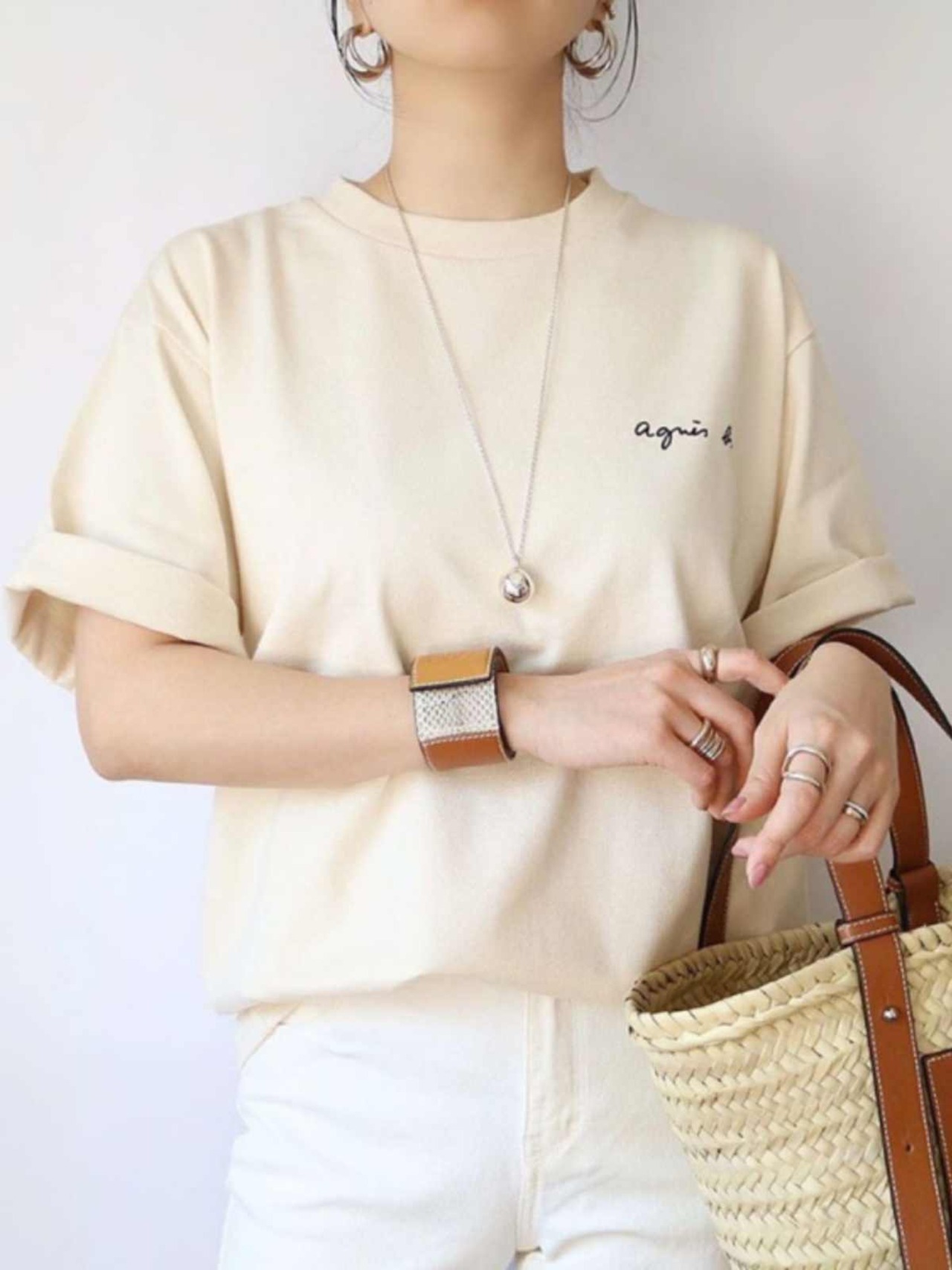アニエスベーのブランドロゴがフロントにプリントされた半袖Tシャツ。あえて小さめのロゴがさりげなくブランドをアピール。