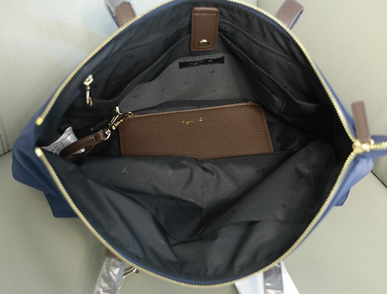 レザーハンドルとゴールドのジッパーが上品なアクセントを加え、ブランドロゴとメタルチャームがさりげない高級感を演出します。