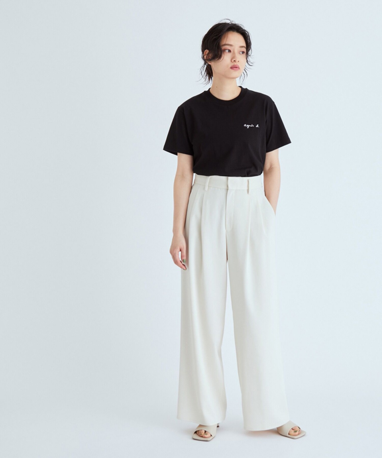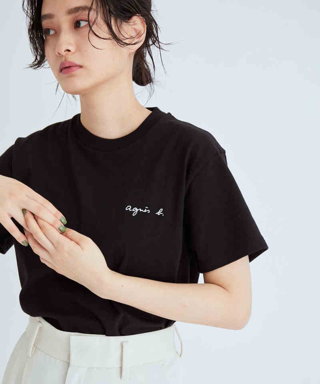 アニエスベーのブランドロゴがフロントにプリントされた半袖Tシャツ。あえて小さめのロゴがさりげなくブランドをアピール。