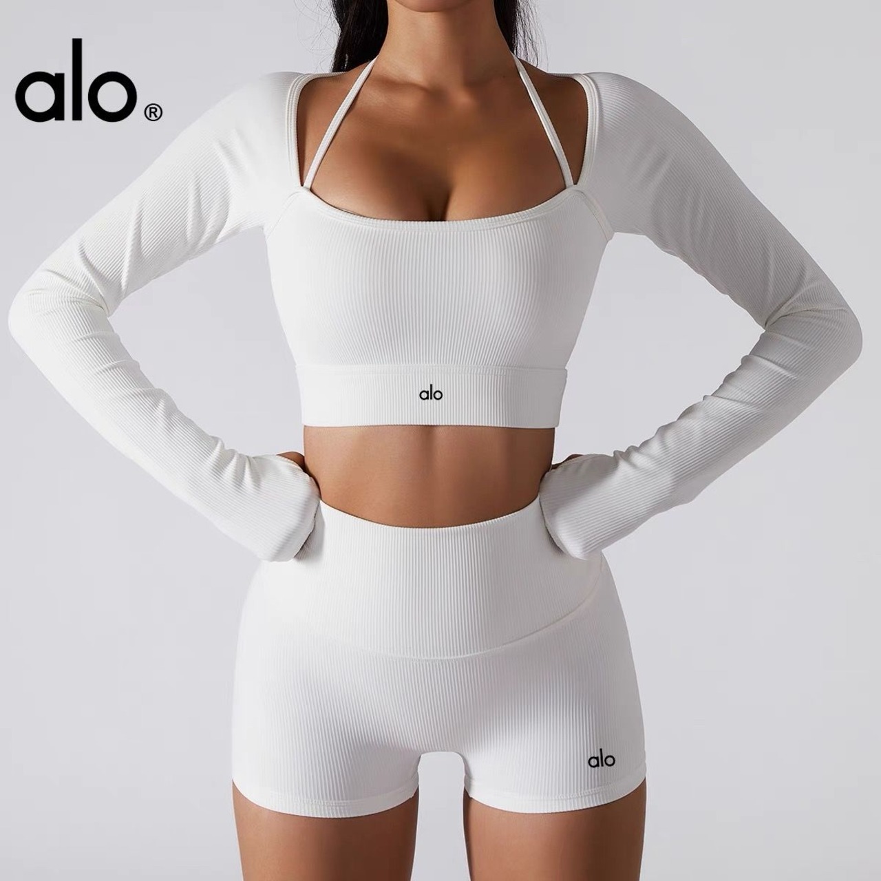 Alo Yoga アロヨガ レディース フィットネス ウェア 上下セット 長袖 Tシャツ 胸パッド付き ショートパンツ へそ出し ヨガ タイト トレーニング ランニング スポーツフィットネス