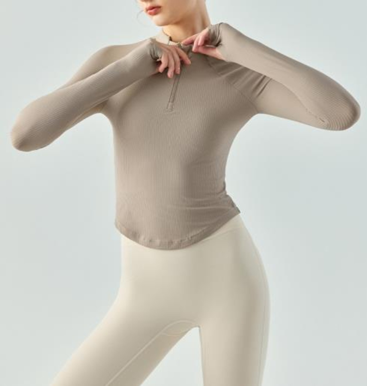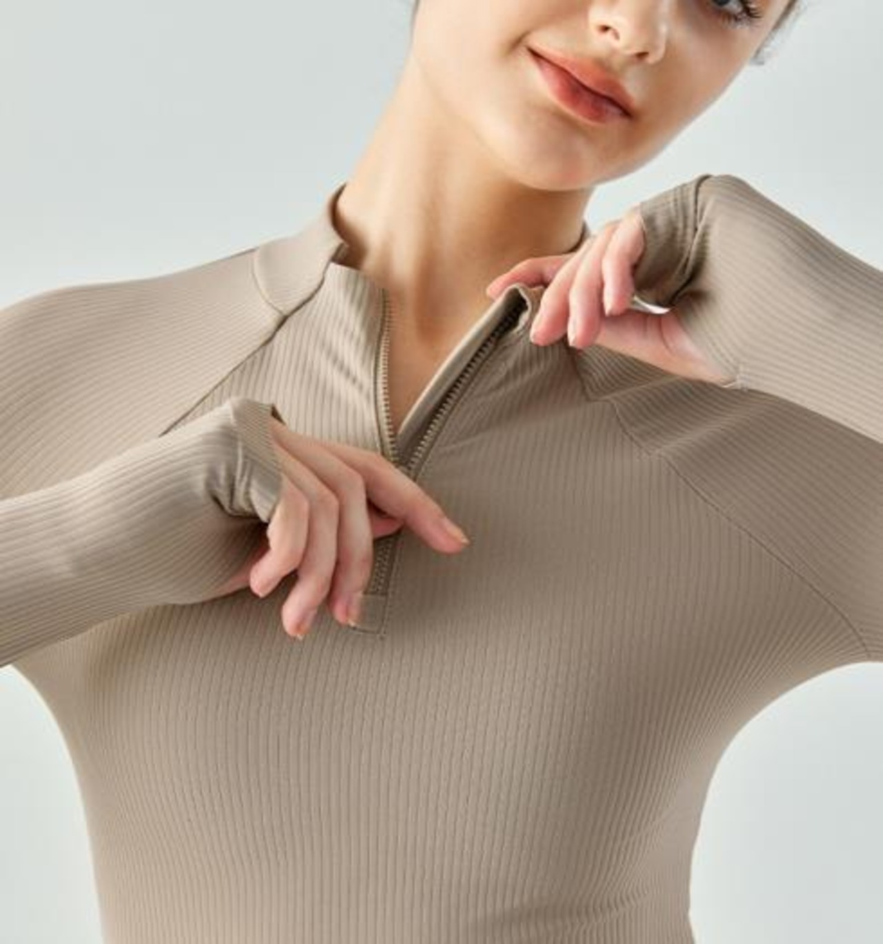 スタイリッシュなリブ素材に、首元のジッパーデザインがアクセントとなり、アクティブな印象を演出します。