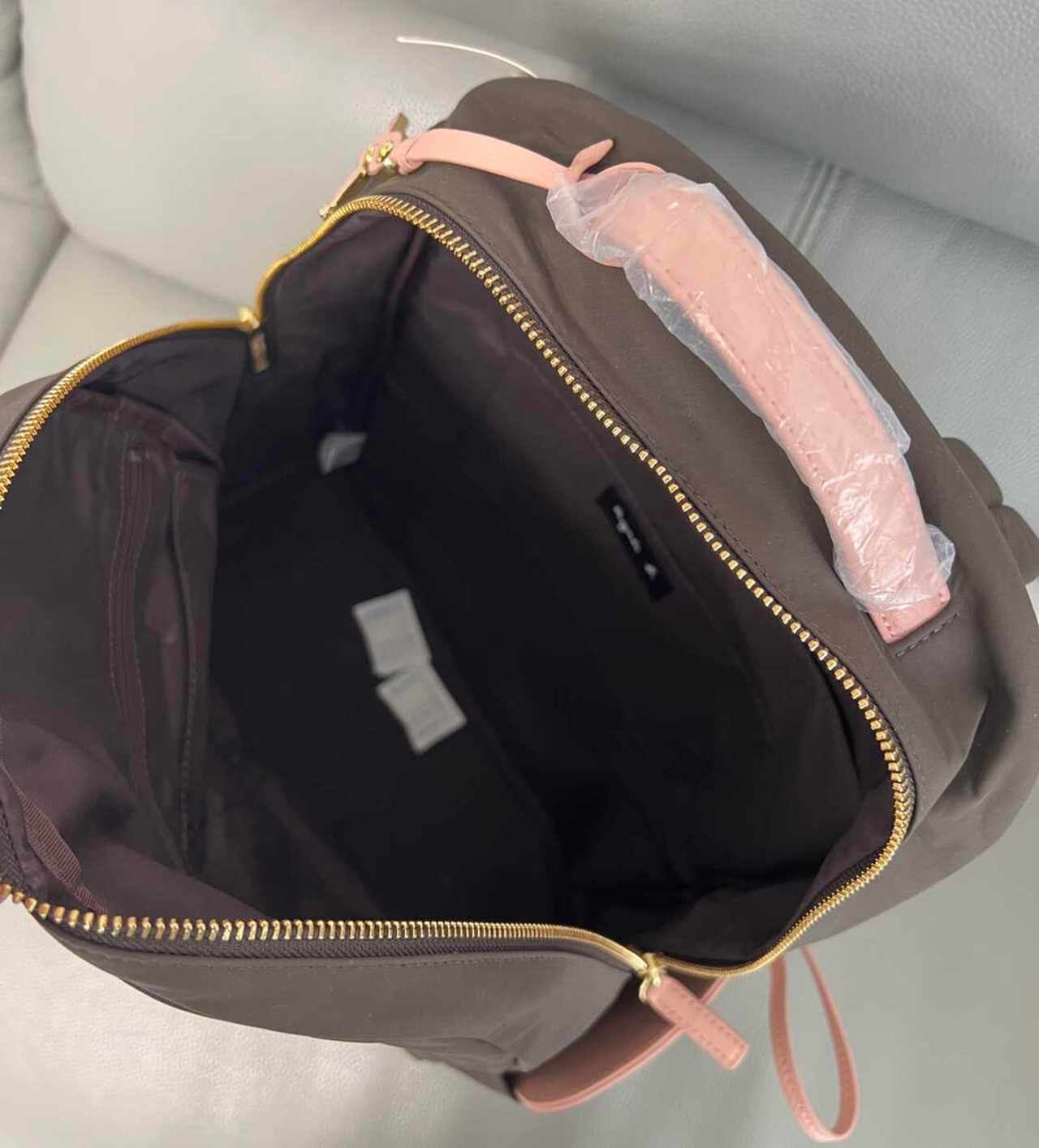 アウトドアウェアでも使用される撥水・透湿素材の高密度のノンコーティングナイロンを使用したバックパック。軽くソフトでしなやかな風合いとナチュラルな外観を兼ね備えたアイテムです。上品な色味のレザーハンドルで、金具にはアクセントになるゴールドカラーをあしらっています。コンパクトサイズですが、ポケットが多く、取り外し可能なポーチが付属しています。