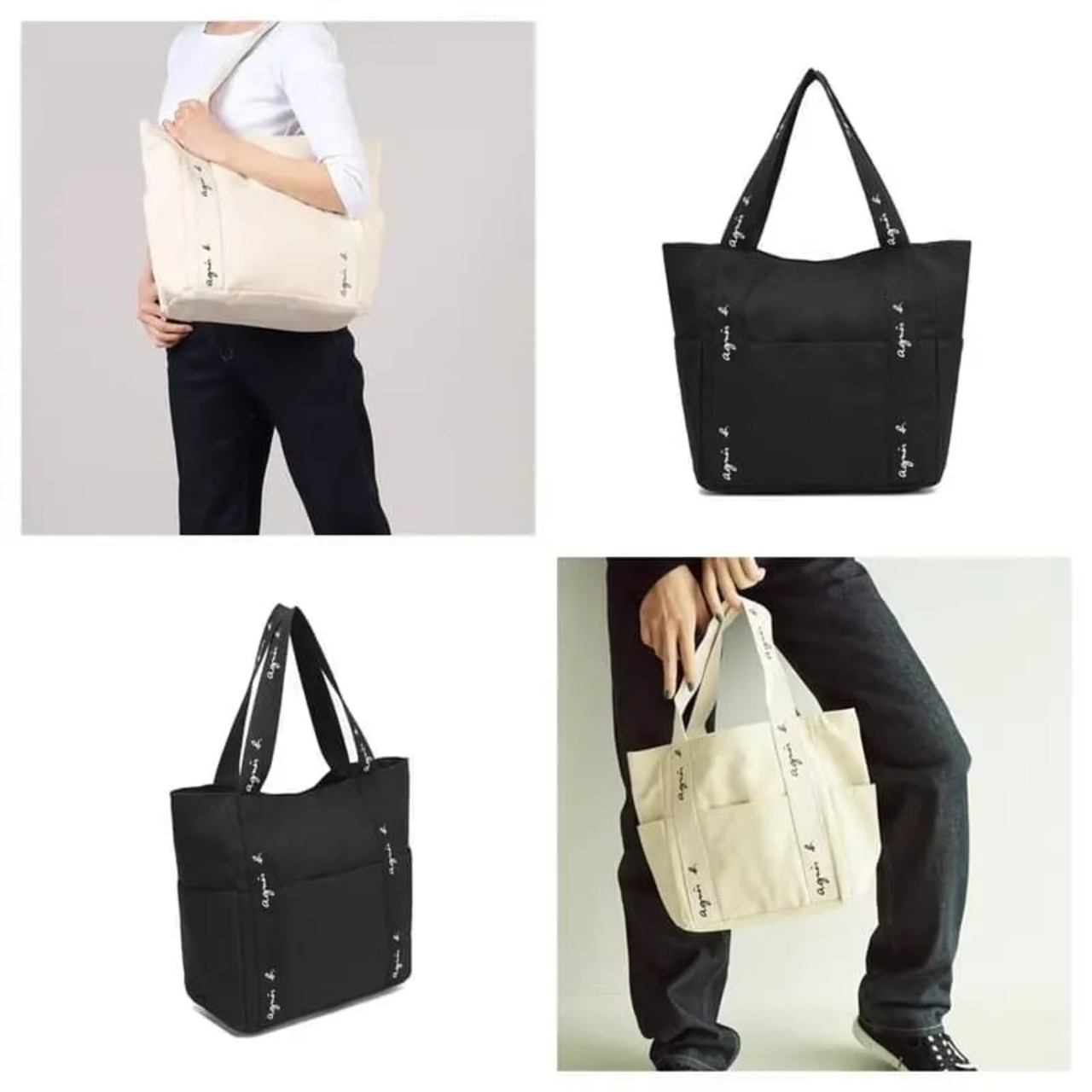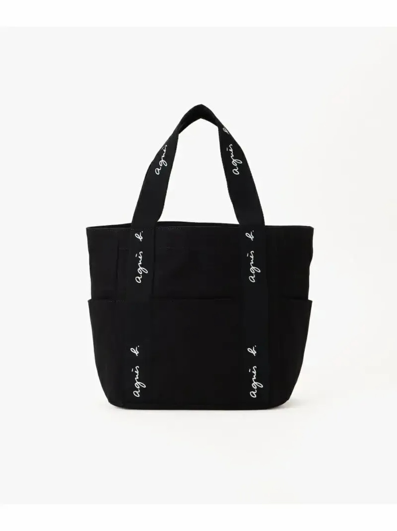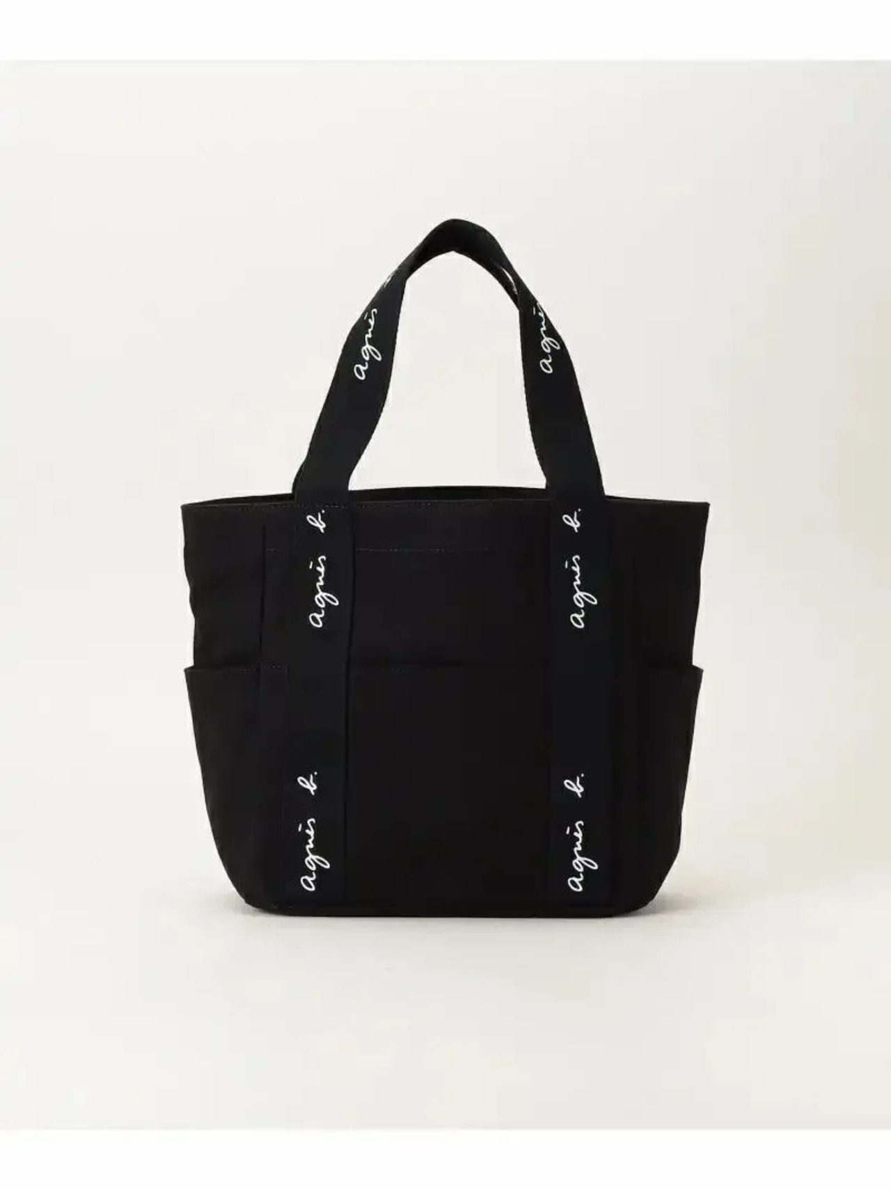 ブラックのキャンバス地にブラックのagnesb.のロゴテープの配色がシックなトートバッグ。