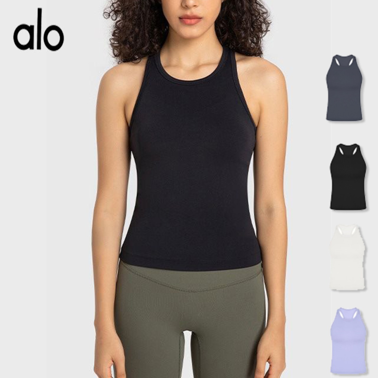 Alo Yoga アロヨガ タンクトップ レディース カップ付き LOGO ノースリーブ ロゴ ワンポイント 刺繍 無地 ホワイト ブラック グレー ピンク