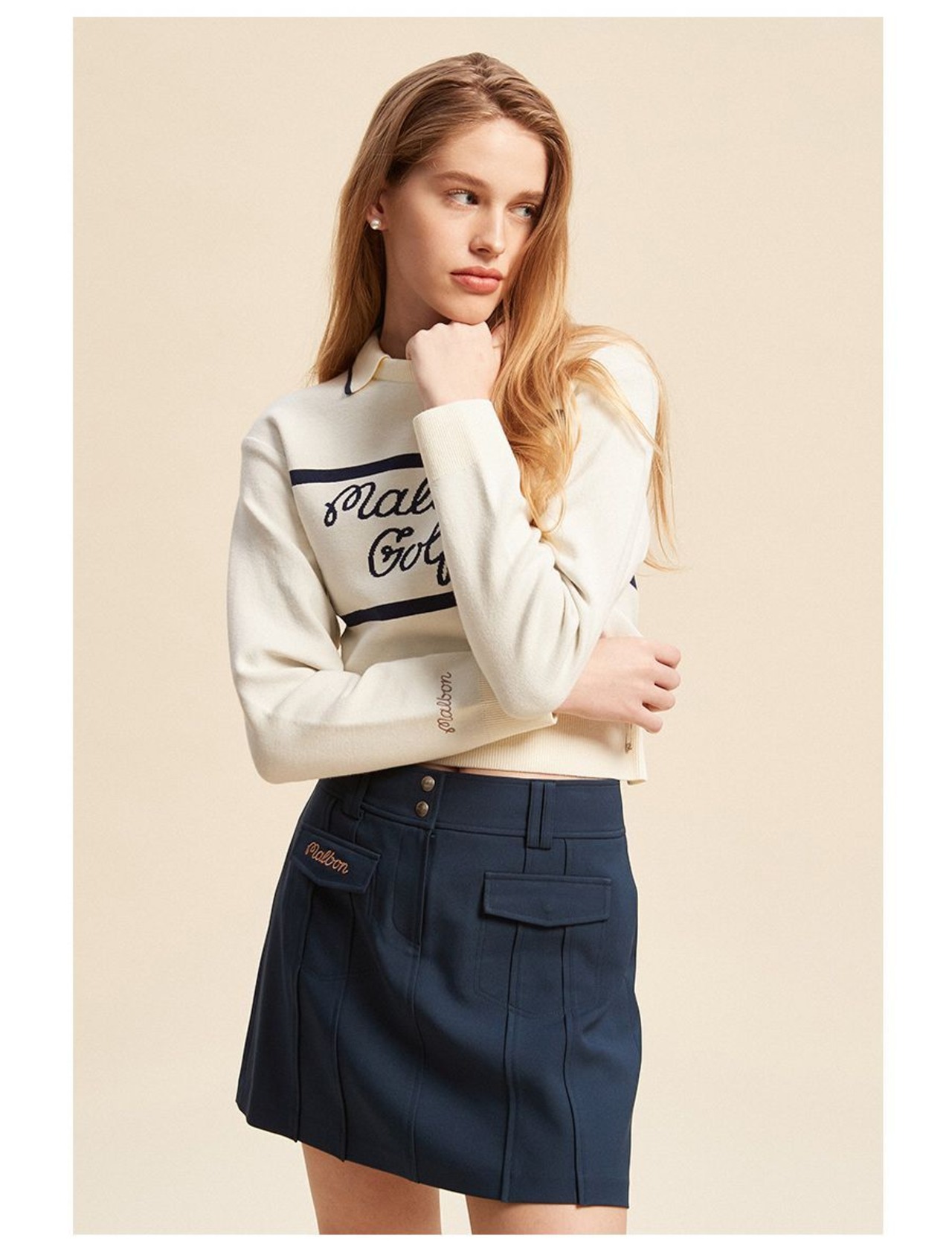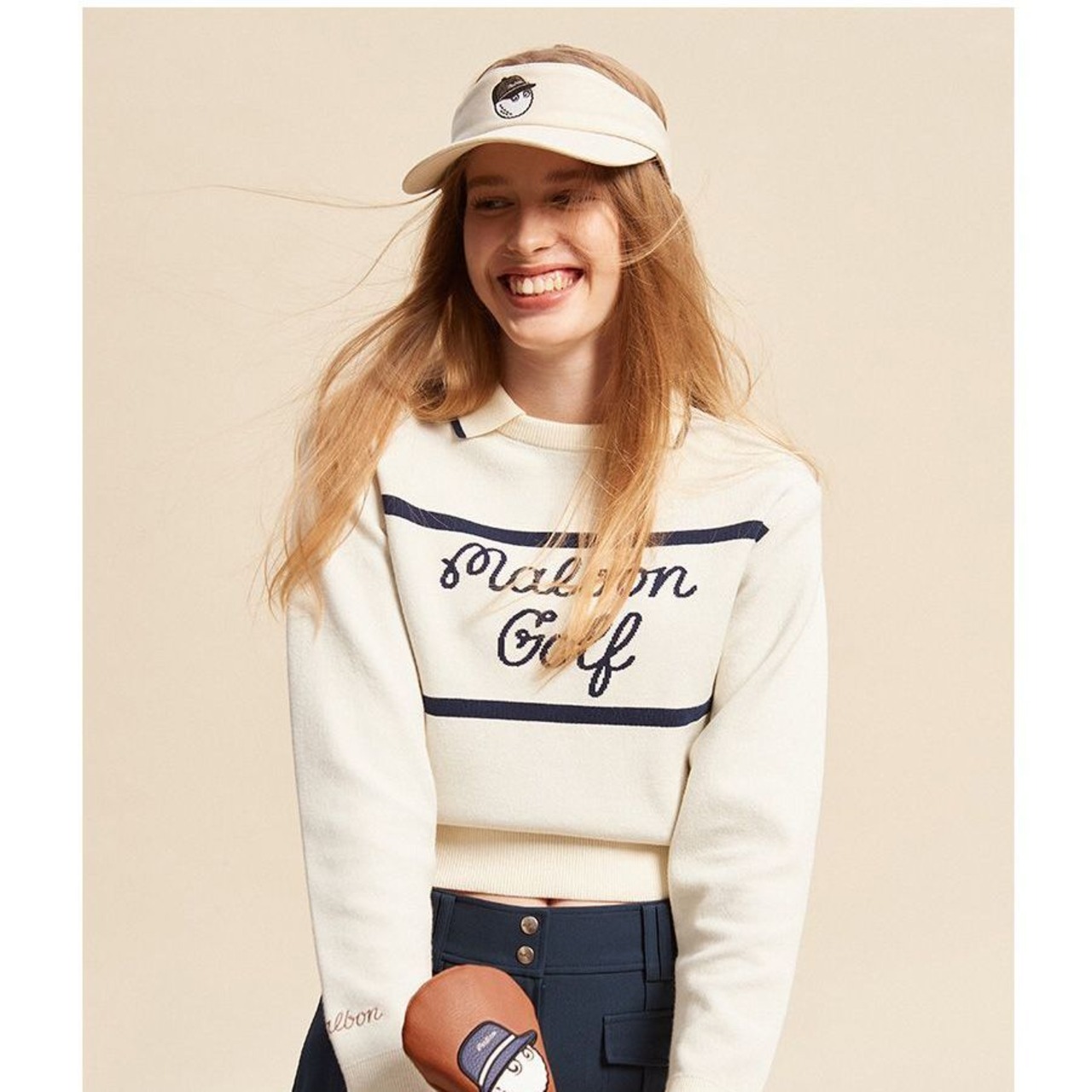 malbon golf マルボンゴルフ 長いセーター ポロニット 長袖 新作 レディース スポーツ カジュアル 防寒 暖かい ベージュ ネイビー
