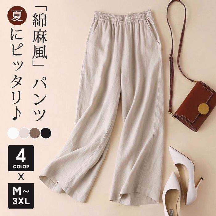 ワイドパンツ 綿麻風 無地 夏 レディース 9分丈 リネン レディース パンツ OL 通勤 おしゃれ ウエストゴム 薄手 カジュアル