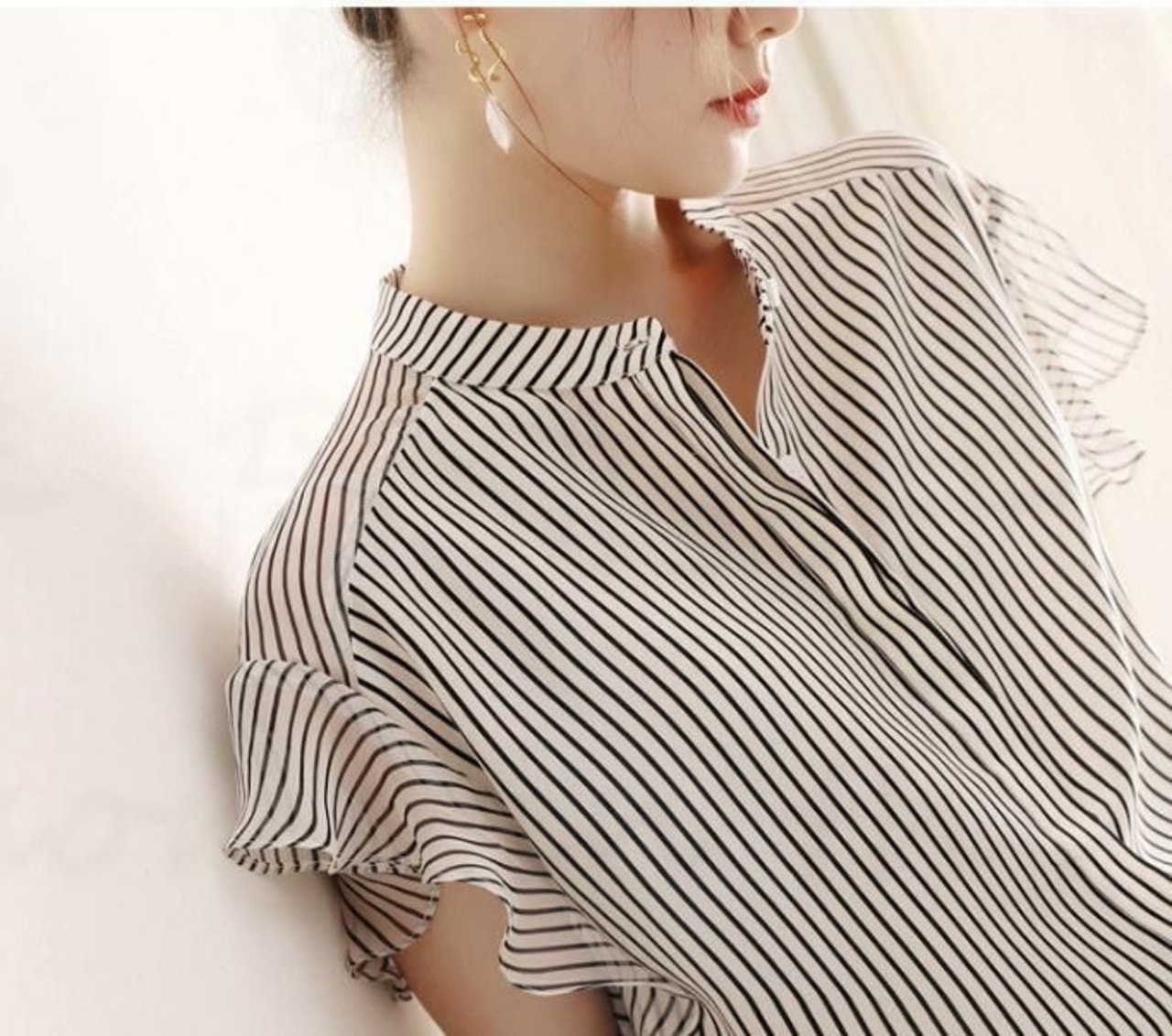 未使用 ストライプ シャツ シフォン レディース ブラウス 夏 半袖ブラウス オフィス シャツブラウス レディース おしゃれ 袖口フリル 切り替え 前開き フォーマル オフィス 着痩せ 上品 きれいめ 20代 30代 40代 chaoliu108