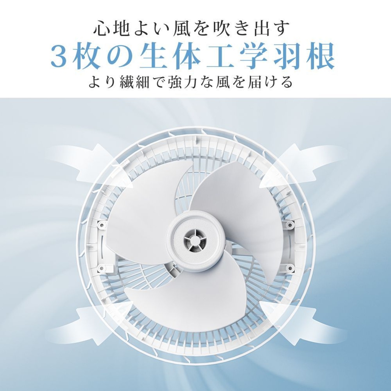 サーキュレーター扇風機は直接風を浴びて涼む本来の機能に加え、冷暖房時の空気の循環や衣類の部屋干し、部屋の換気にも効果を発揮します。夏はエアコン、冬は暖房と併用すると電気代の節約につながります。ほかにも換気を補助したり、部屋干しの乾燥を手助けしたりすることも可能。夏の冷気循環、冬の暖気循環、春秋の換気、梅雨時期の乾燥や洗濯物干しなどに大活躍しています。また、3段階の高さ調整が可能で、さまざまなシーンに適応できます。