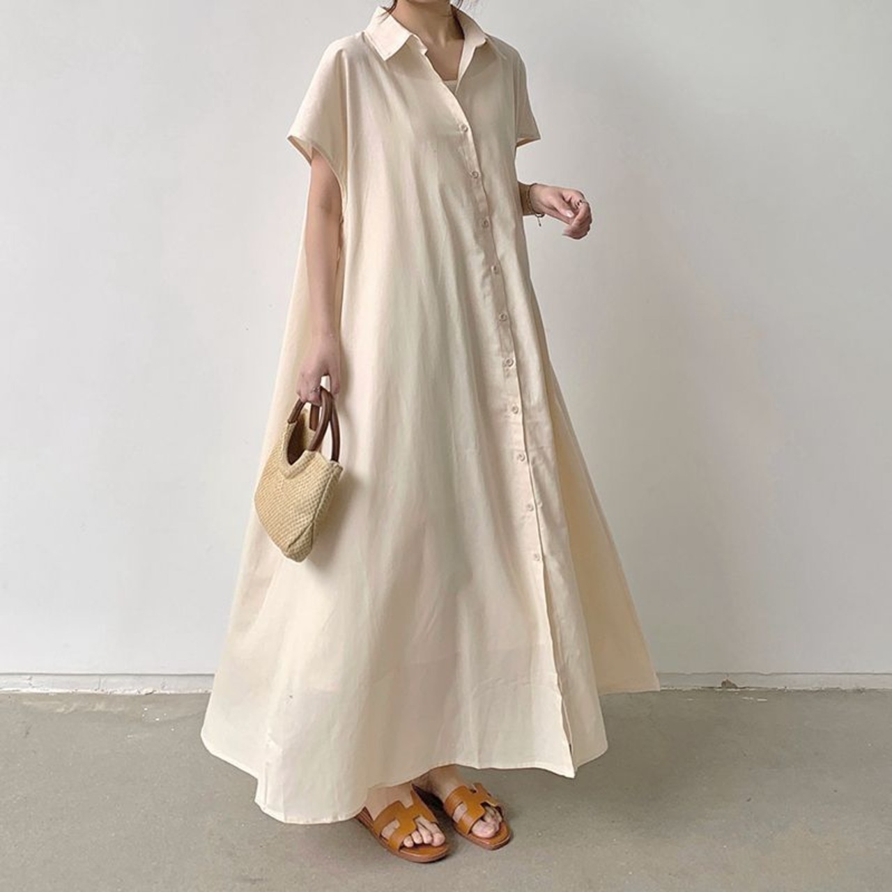 シャツワンピース 夏 レディース 半袖 リネン ワンピース ロング丈 Vネック ゆったり シンプルワンピース 大人 Aライン 体型カバーskwhyr08