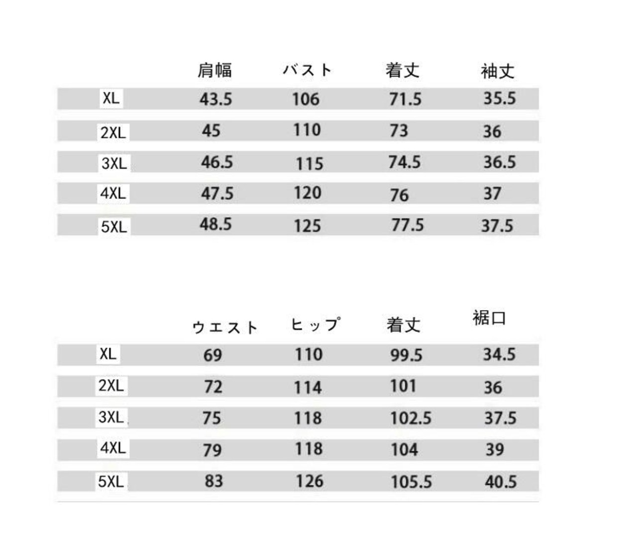 サイズ:XL(日本M相当) 2XL(日本L相当) 3XL(日本XL相当) 4XL(日本2XL相当) 5XL (日本3XL相当)