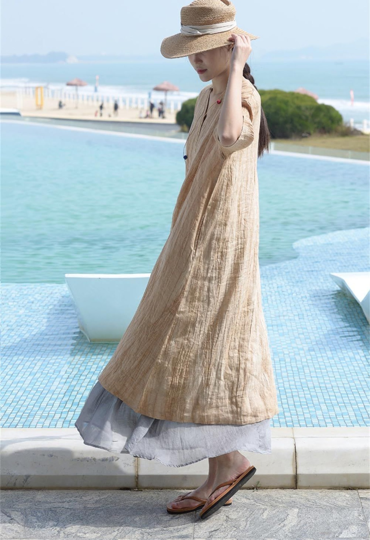 リネン風の生地は通気性に優れ、春夏秋を通しておすすめの素材肌にまとわりつきにくく、熱がこもりにくいのでサラッと気持ちよくお過ごし頂けます。特に、軽量でサラッとした生地感が特徴であり、一日中快適に過ごすことができます。