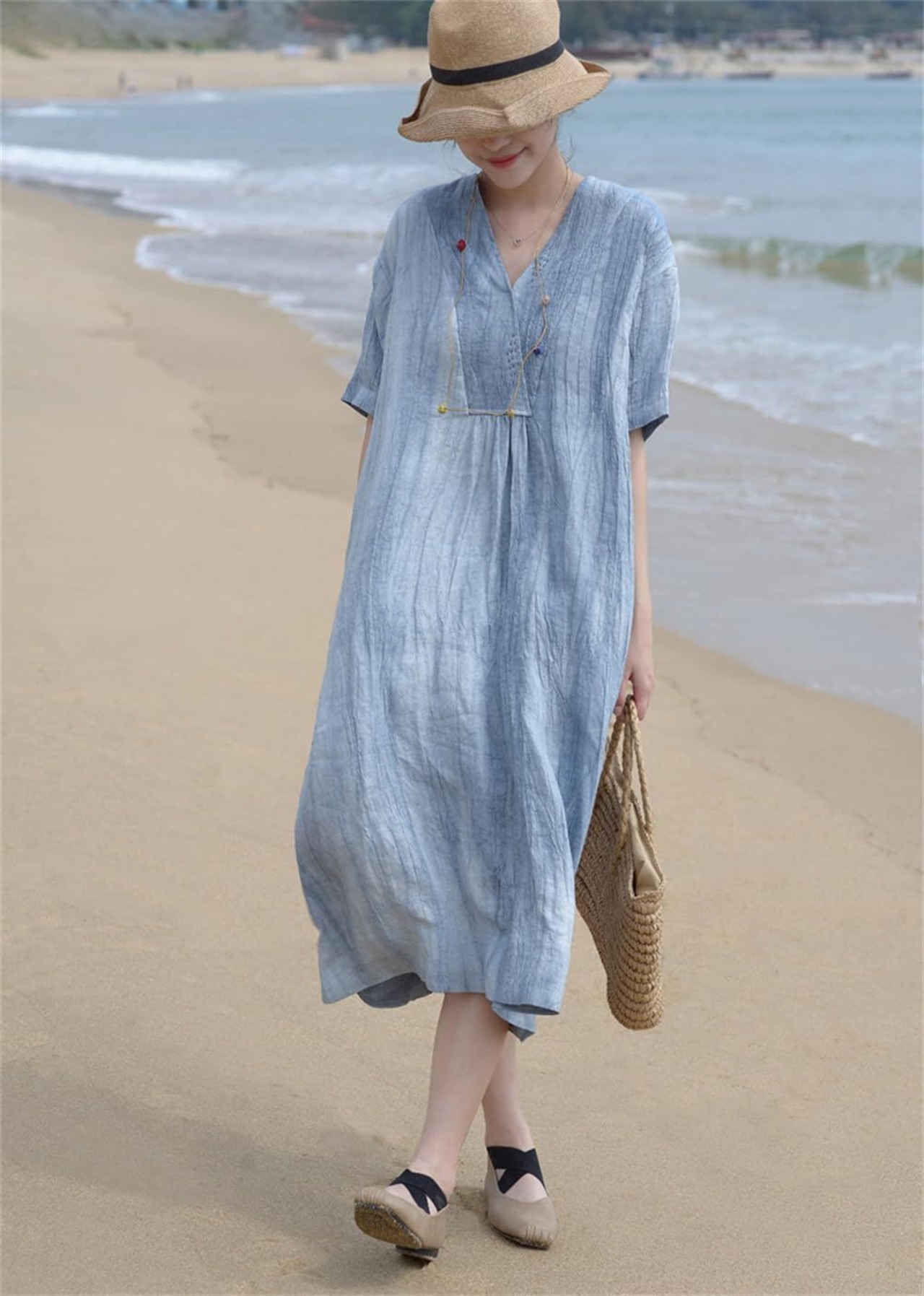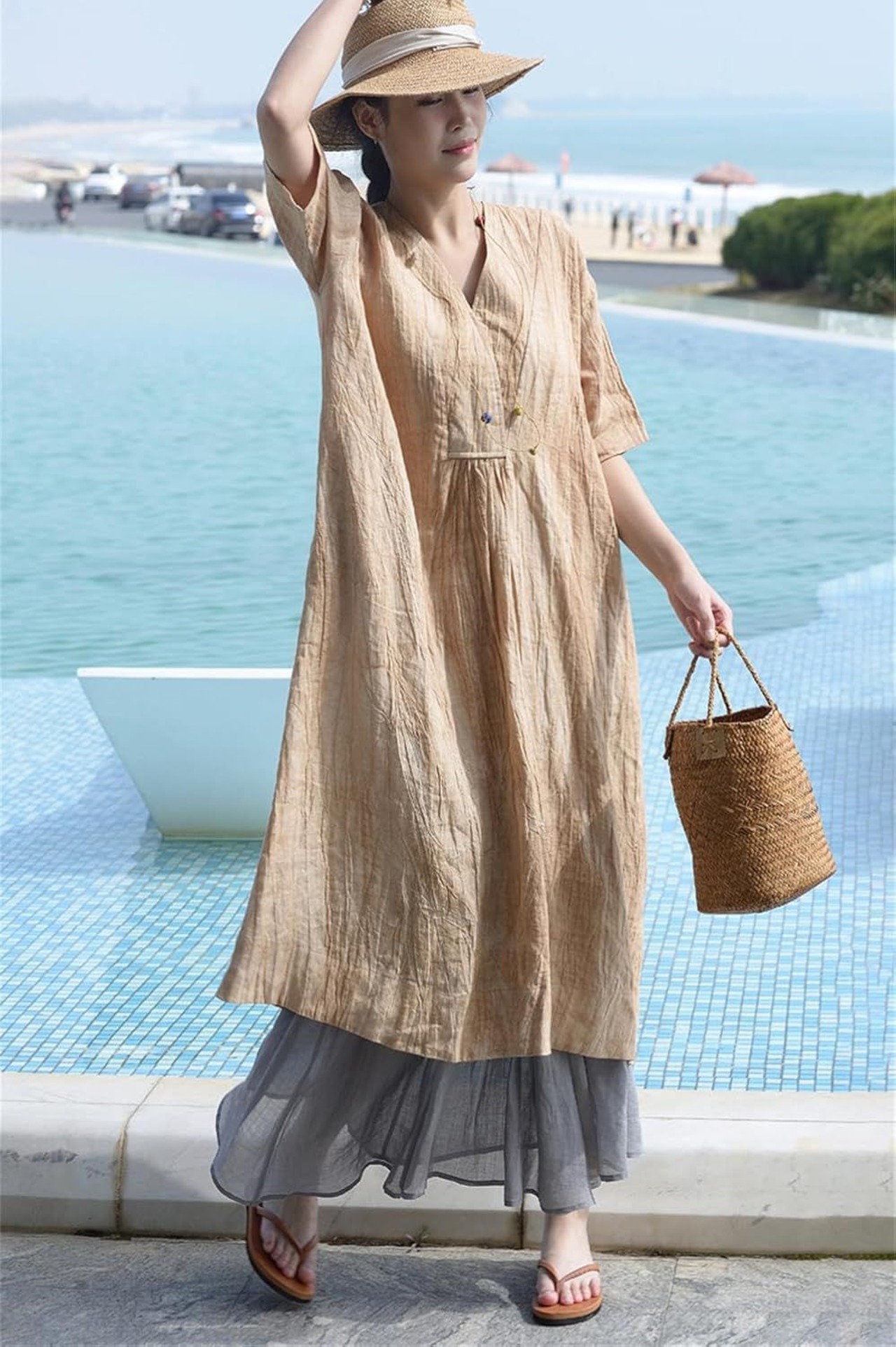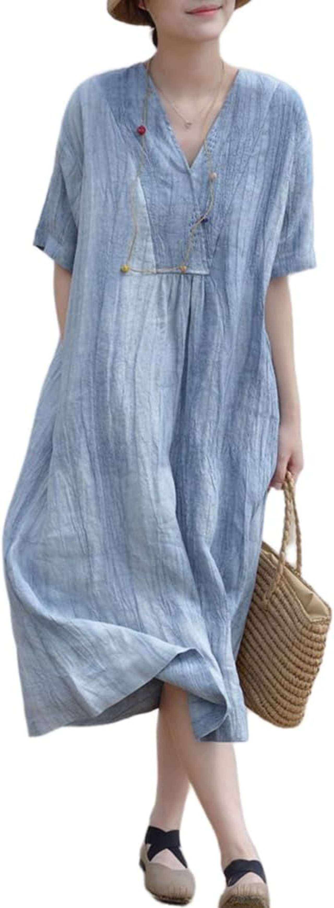 綿麻ワンピース レディース 接触冷感 Aライン ゆったり 薄手 着痩せ 半袖 無地 Vネック 体型カバー 大きいサイズ カジュアル ゆったり きれいめ 春 秋 夏 zhangban110