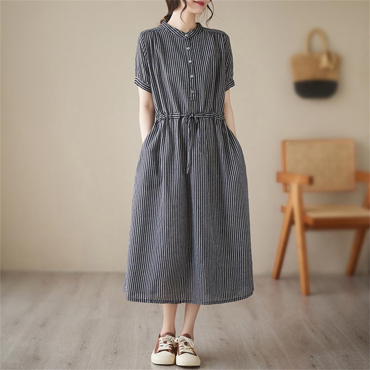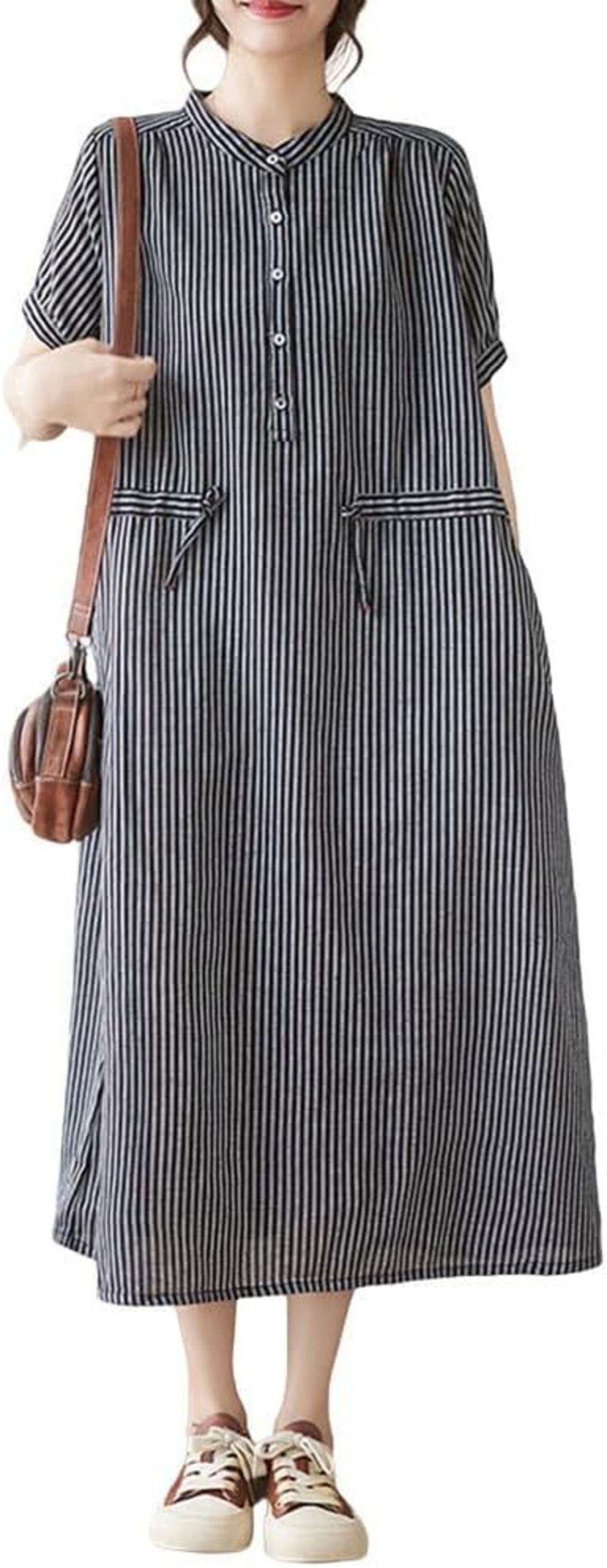 マキシワンピース レディース ストライプ 立ち襟 ポケット付き ロング丈 ドレス ストレート ゆったり ?せて見え カジュアル ボタン付き サマーワンピース 薄手 シンプル 文芸風 通気性 体型カバー 普段着 旅行 お出かけ zhangban113