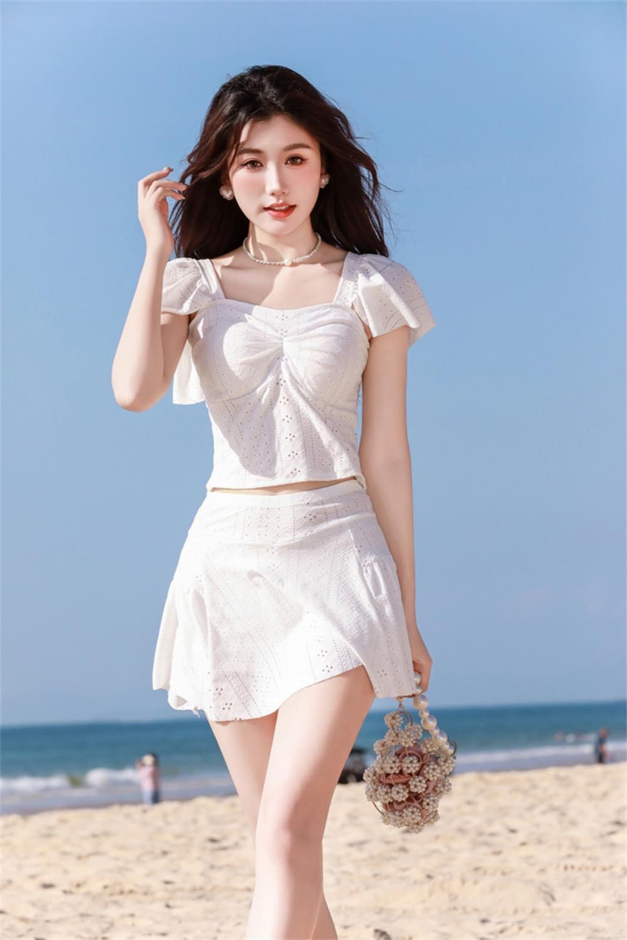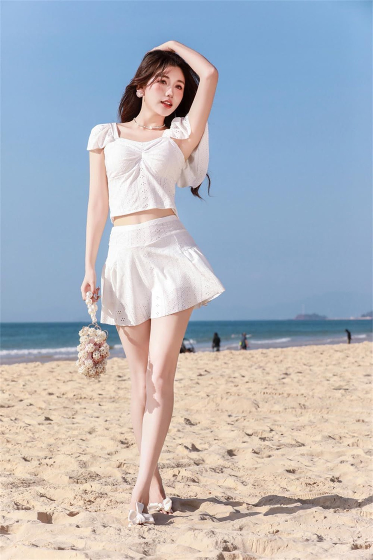 トップスの裾のフリルがウエストをほっそりと見せてくれる効果があります。スカートの裾もフリルがありますので、かわいく体型をカバーしてくれる嬉しい効果があり、女の子らしさを演出するショットパンツになっています。トップスはパッド付きでノンワイヤー仕様なので、ストレスフリー!