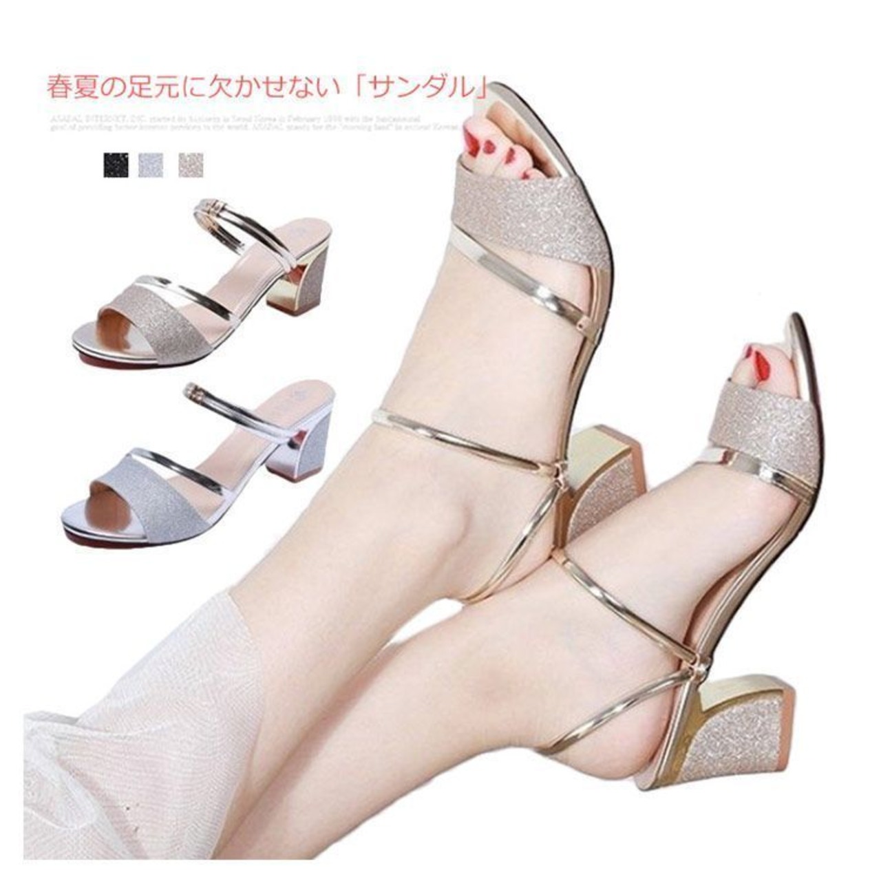 サンダル 即購入OK ミュールサンダル レディース 太ヒール ハイヒール 6cmヒール チャンキーヒール サンダル 美脚 オープントゥ サンダル スリッパ 疲れない 痛くない 歩きやすい トレンド キラキラ 普段 zhangban31