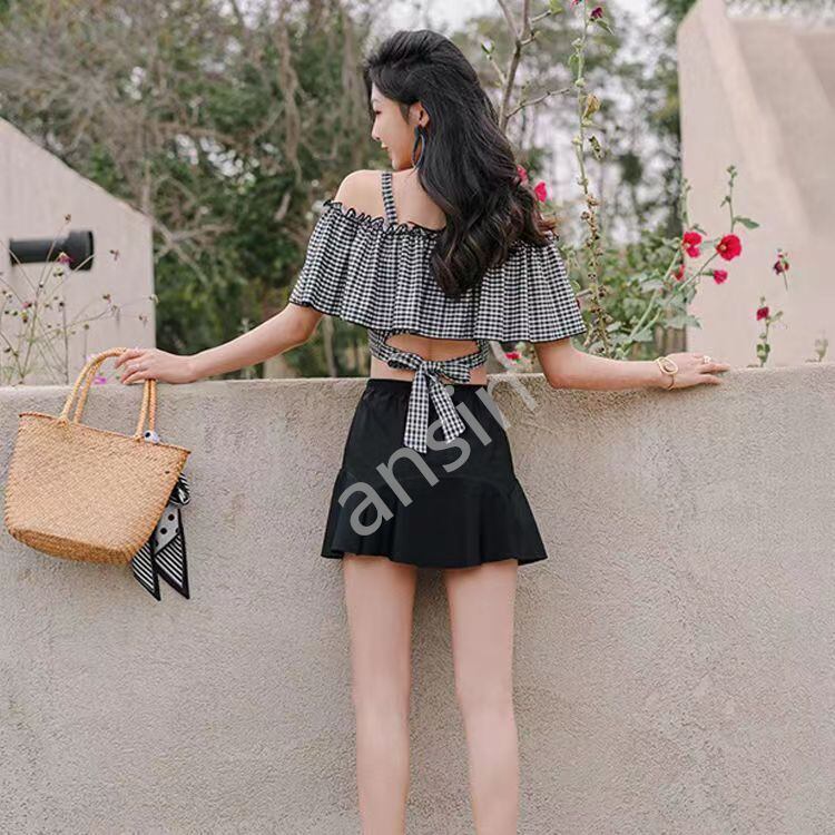 水着 即購入OK レディース オフショルダー ビキニ 格子 チェック柄 セパレート ビスチェ風 ビキニセット フィットネス 肩出し スカート ハイウエスト パッド付 小胸 バスト 盛れる おしゃれ かわいい 高校生 母の日 zhangban25