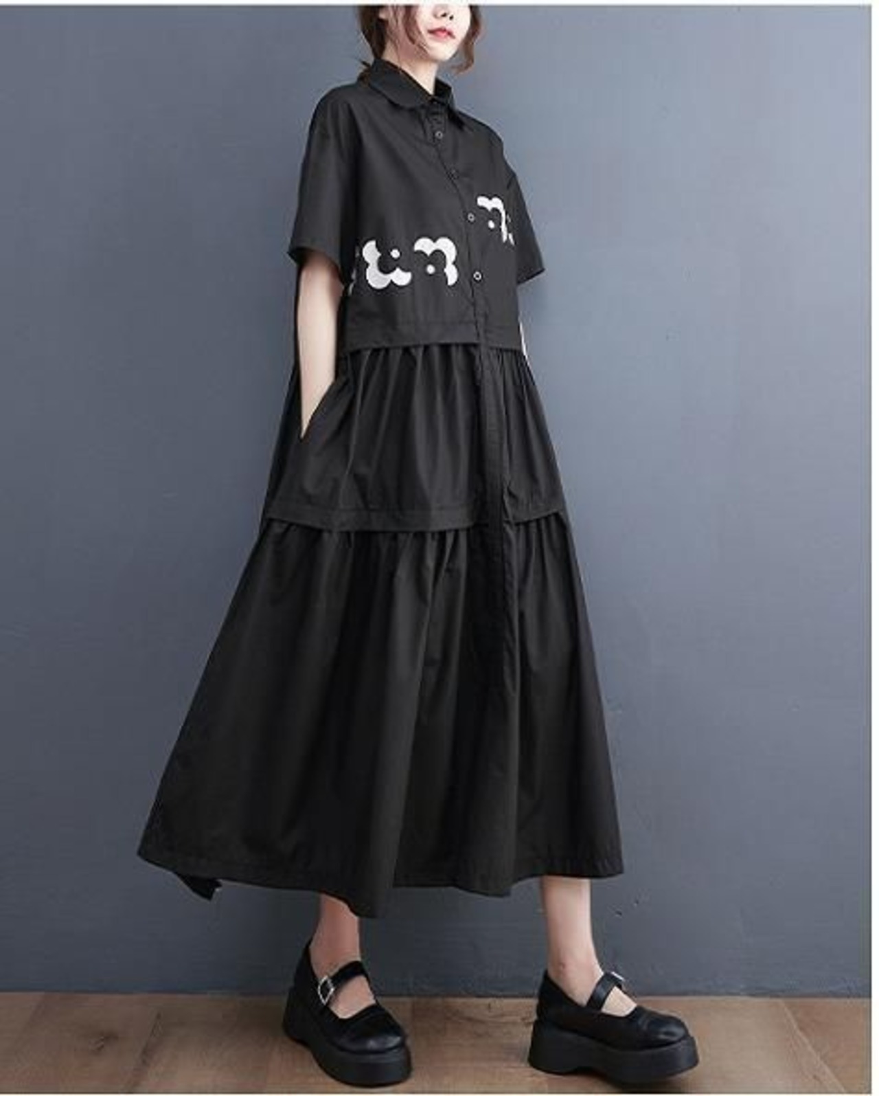 モード系 黒ワンピース 個性派 ニューデザイン 白花ワンピース 大きいサイズ レディース 春 夏 ロング ワンピース 新品 半袖 秋