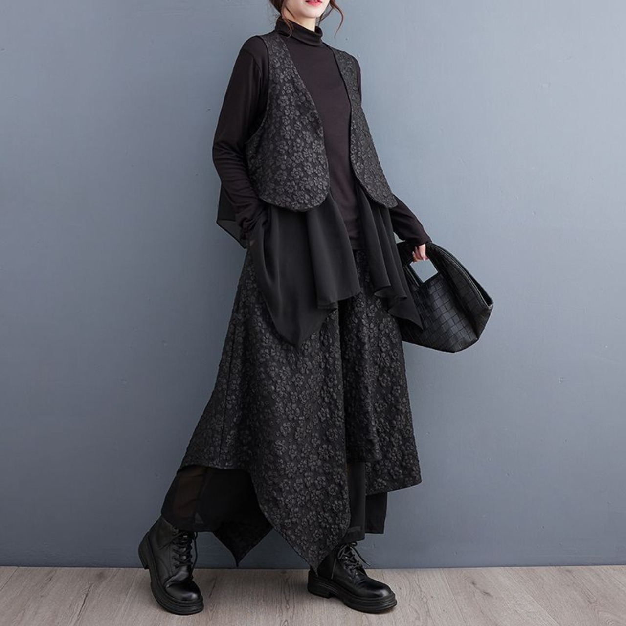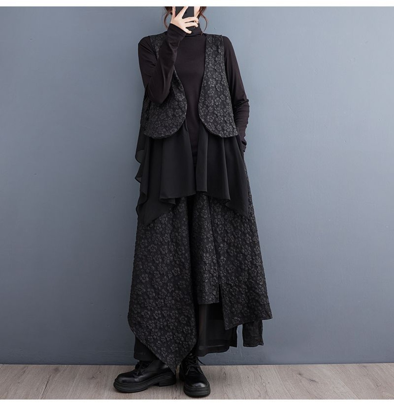 モード系 2点セット ニューデザイン 秋冬 新作 レトロ 気質 ジャカードシフォン 二層ベスト+イレギュラーワイドレッグパンツ ツーピーススーツ 個性的なデザイン 新品