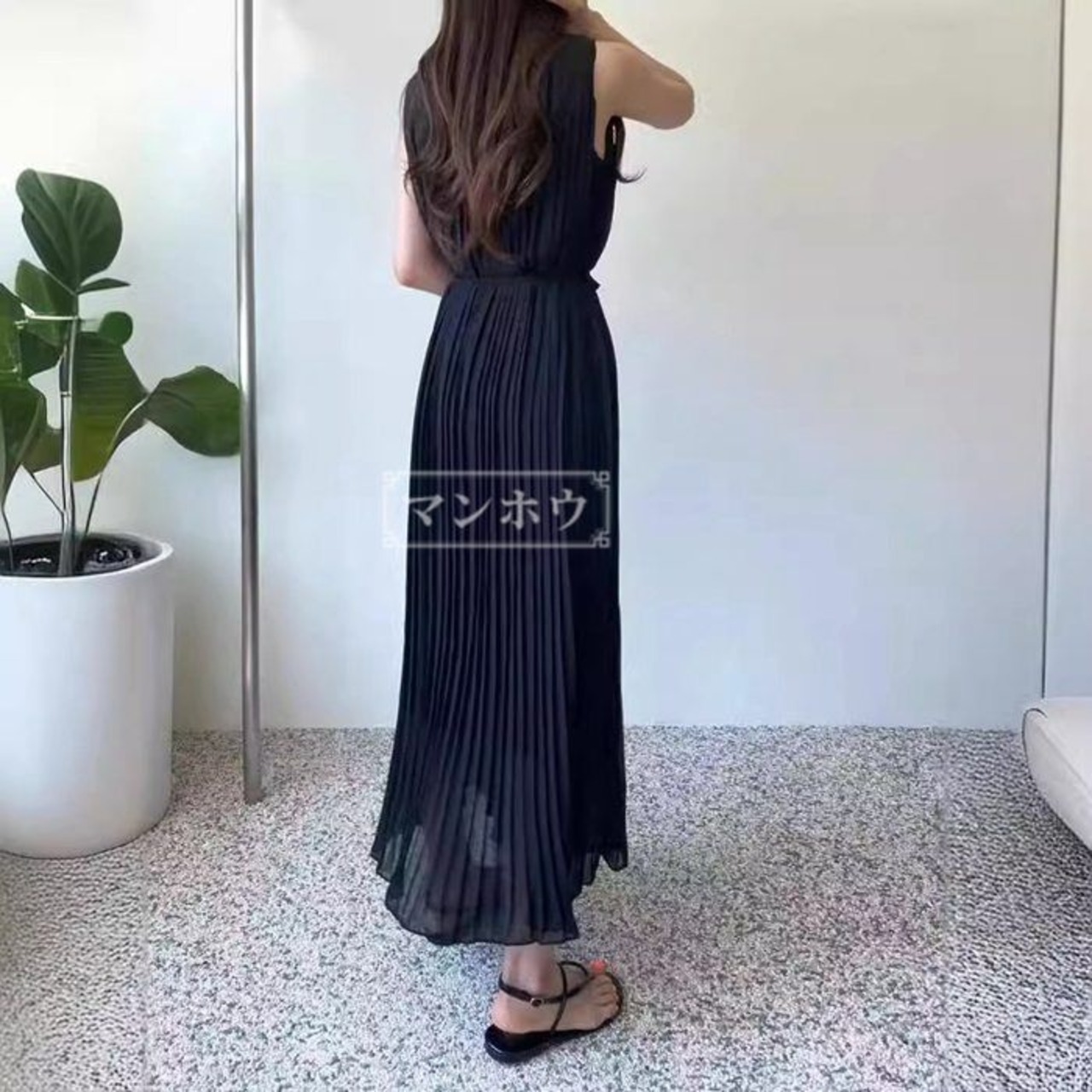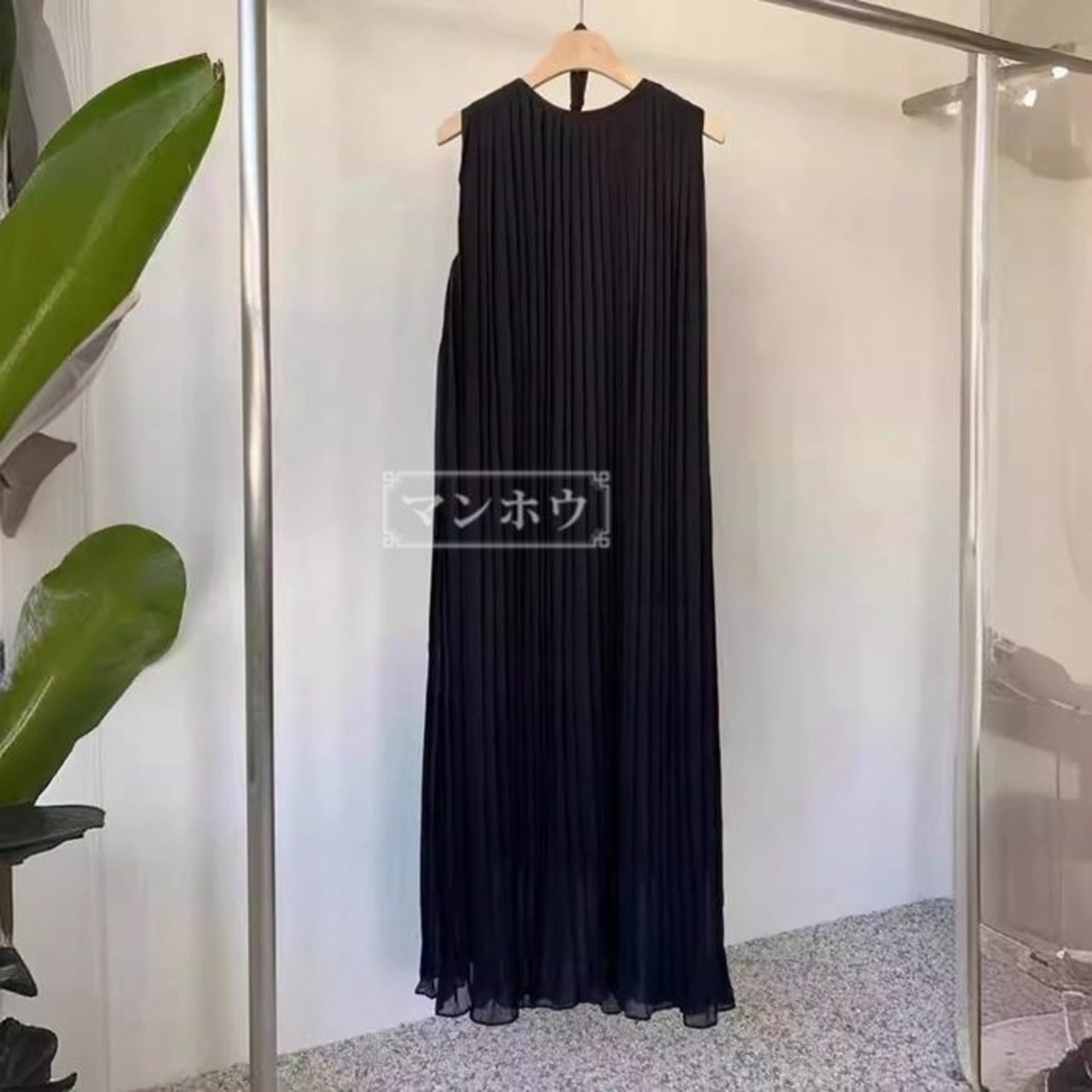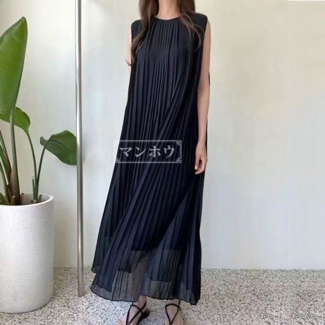 ワンピース ノースリーブ プリーツ ロングワンピース 夏 レディース ブラック 涼しい タンクトップ ロング丈 大きいサイズ シフォン ワンピース 体型カバー 着痩せ 着回し 美シルエット 春 yihaizhi01