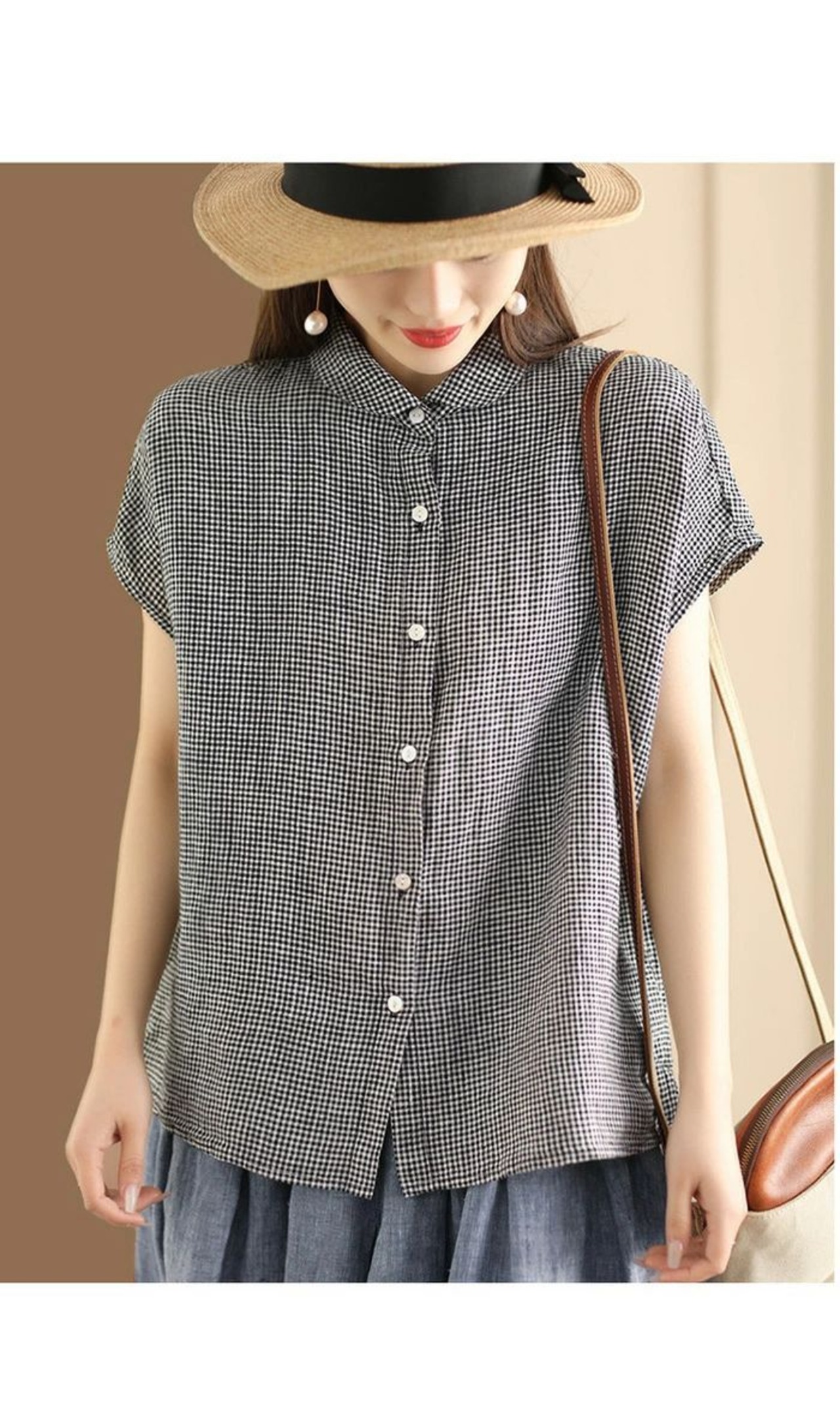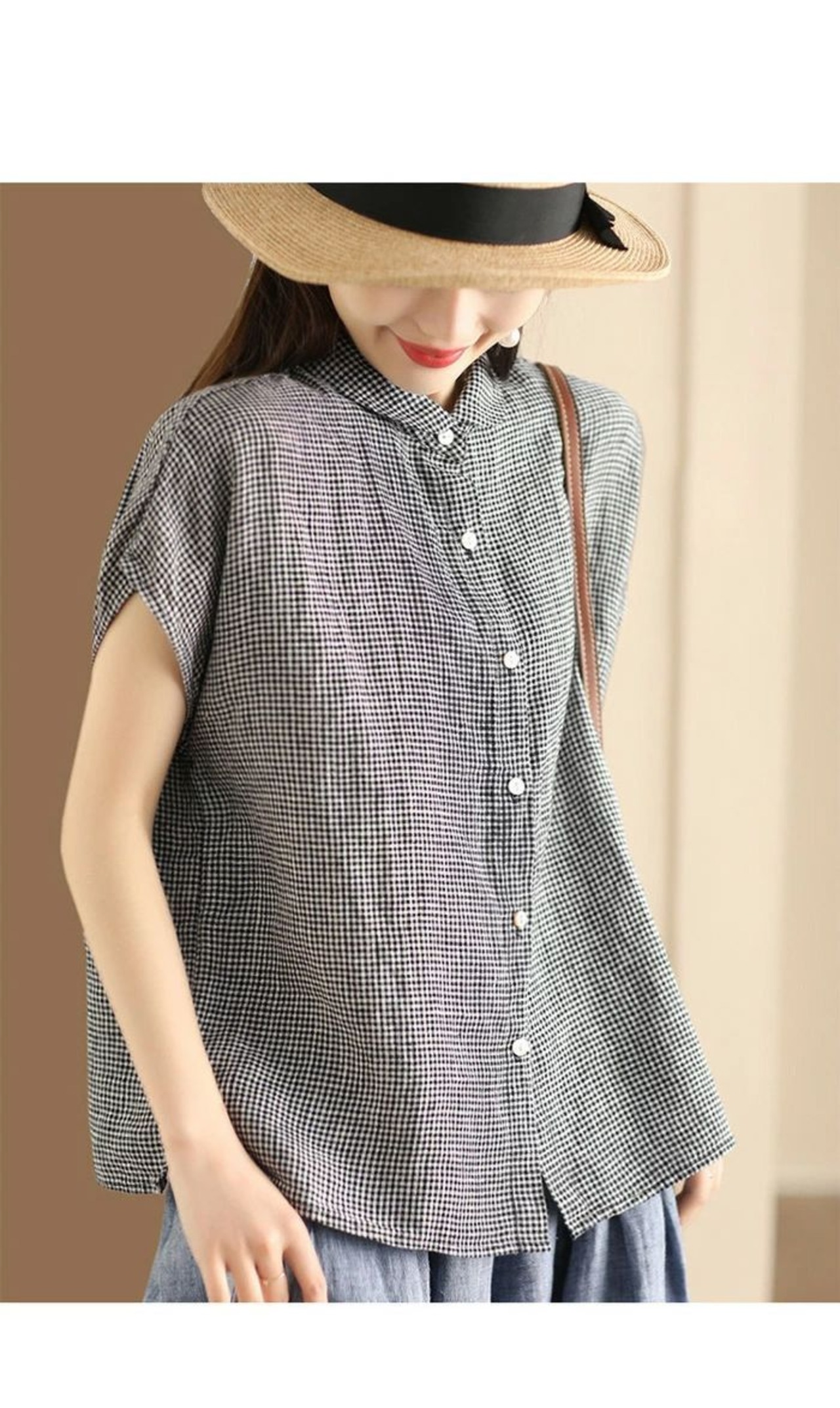 シャツ 即購入OK ブラウス レディース フレンチスリーブ シャツ 夏 ふんわり シャツブラウス 綿麻風 チェック トップス 半袖 大きいサイズ ゆったり 体型カバー カジュアル ナチュラル 無地 abama01