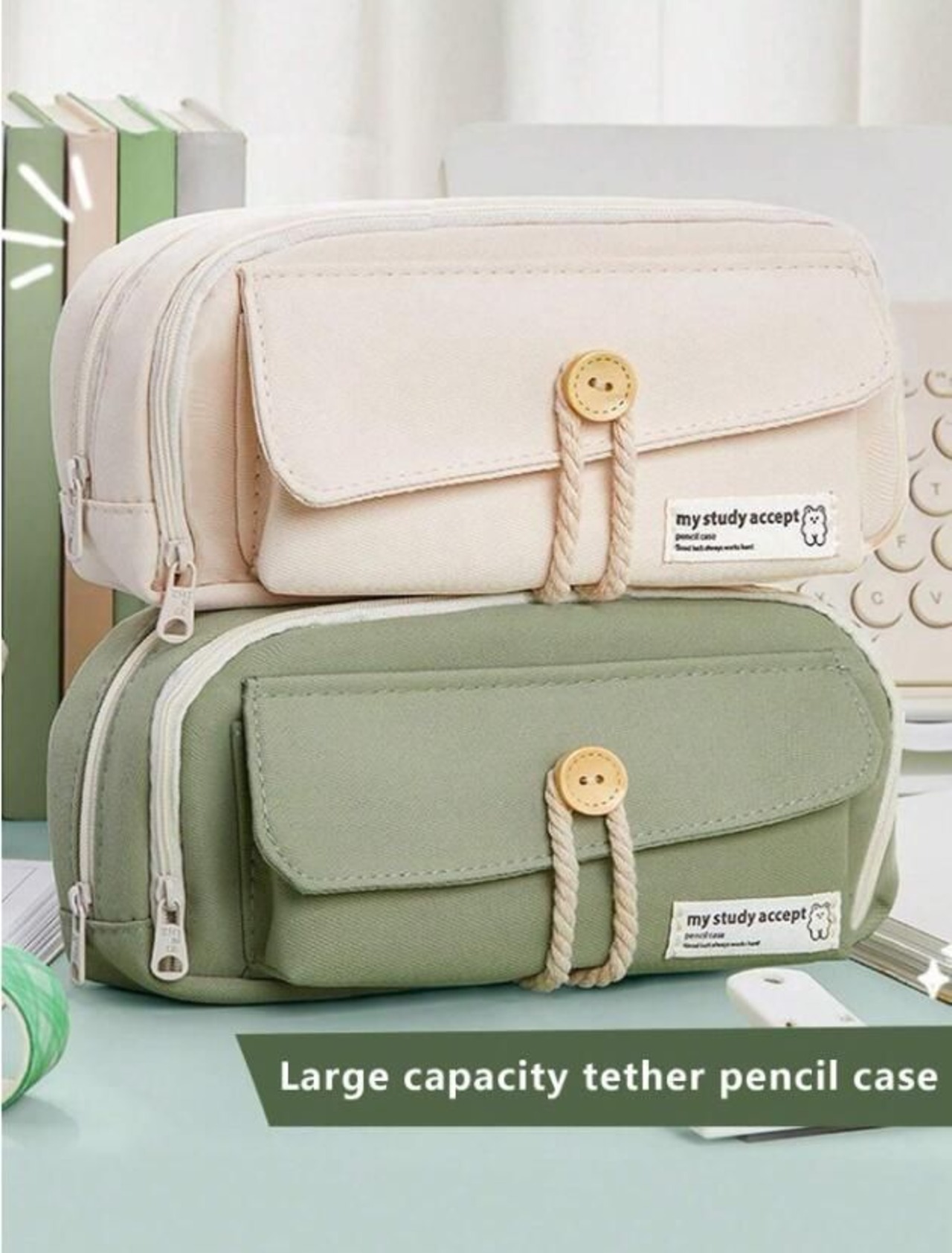 【ペンが探しやすい】後ろのファスナーを開ければ、見開き式になるので、中身が見やすい。外側ボタンのデザインは、付箋や消しゴムなど、小さい文房具も取り出しやすく非常に便利、飾りとしてもかわいいです。また、持ち手も付いているので、持ち運びにも便利です。