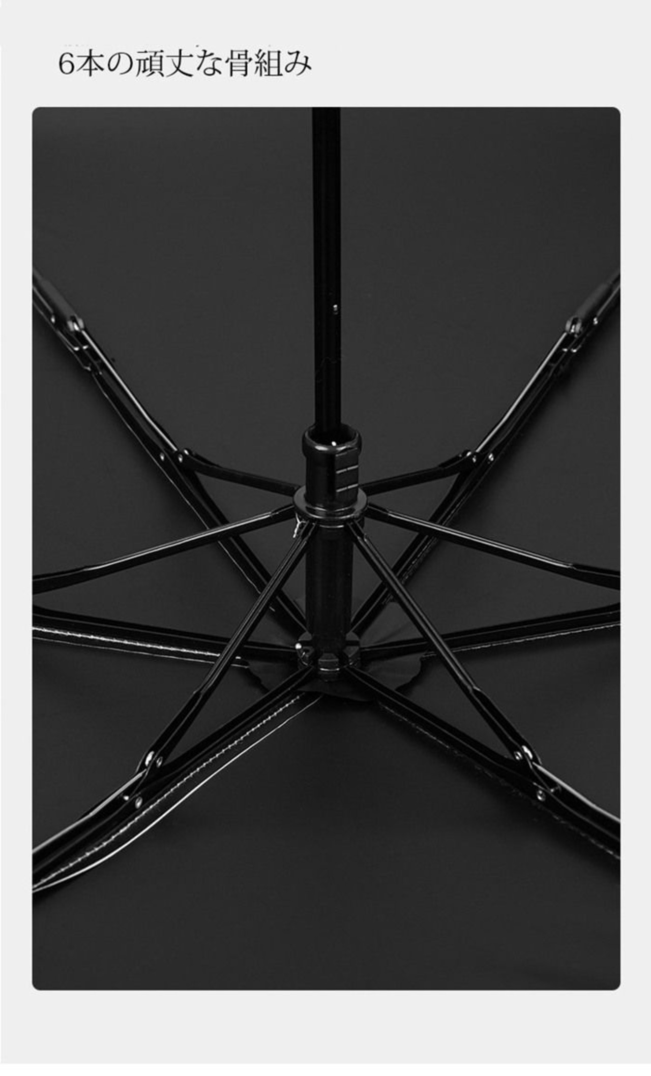 【6本の骨】6本の頑丈な骨組みと曲がったフック付きのハンドルを備えています。これにより、強風や悪天候にも耐えることができます。より頑丈で風に強い設計により、耐風性と耐久性ともに向上させた折り畳み傘です。強風にも安心な耐風傘です。