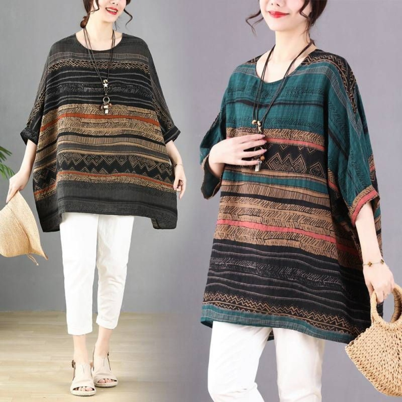 チュニック レディース 大きいサイズ 綿麻 五分袖 夏 Tシャツ ブラウス プルオーバー ゆったり トップス 総柄 カットソー チュニックワンピース フレア キレイめ カジュアル エスニック風 ビッグシルエット 春 秋 大人可愛い 送料無料 chaoliu420