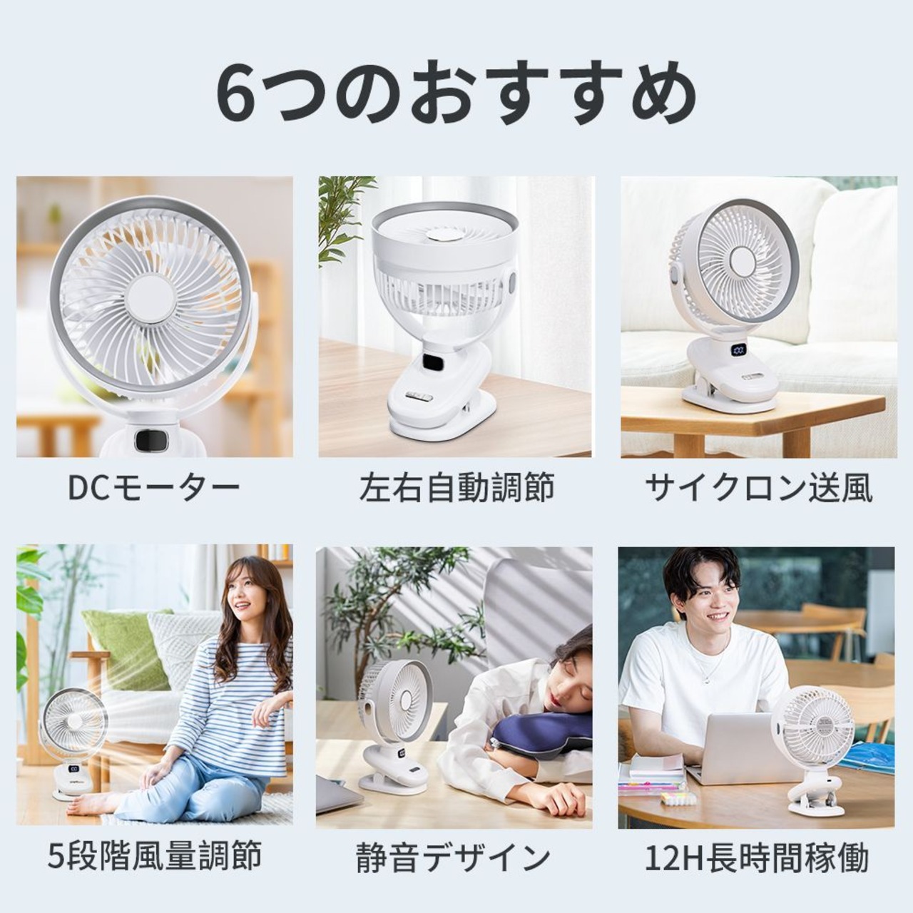 クリップで様々な場所に取り付けられる利便性と、5段階の風量調節、そして12時間という長時間の連続稼働能力が組み合わさることで、より多くのシーンで「快適な涼しさを持続させる」ことが可能になります。クリップで固定すれば、多少の振動があっても安定して風を送れますし、長時間稼働のおかげで移動先でも電池切れの心配が少ないです。