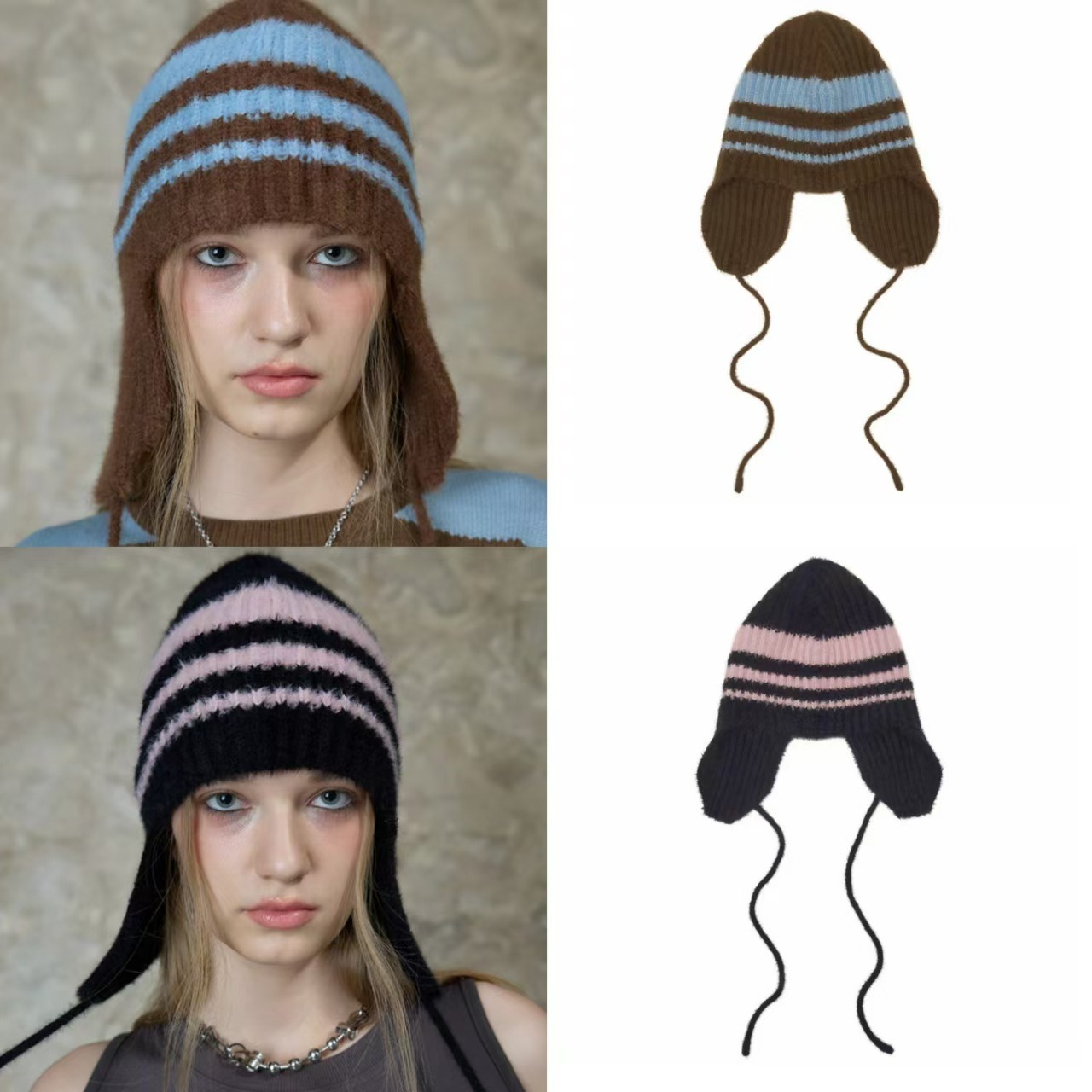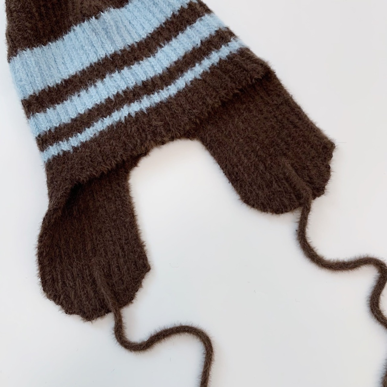 大人気 韓国ファッション ボーダーニットレディースファッション 帽子 ニットキャップ ストライプ トルーパー ハット L13 STRIPE TROOPER HAT BROWN