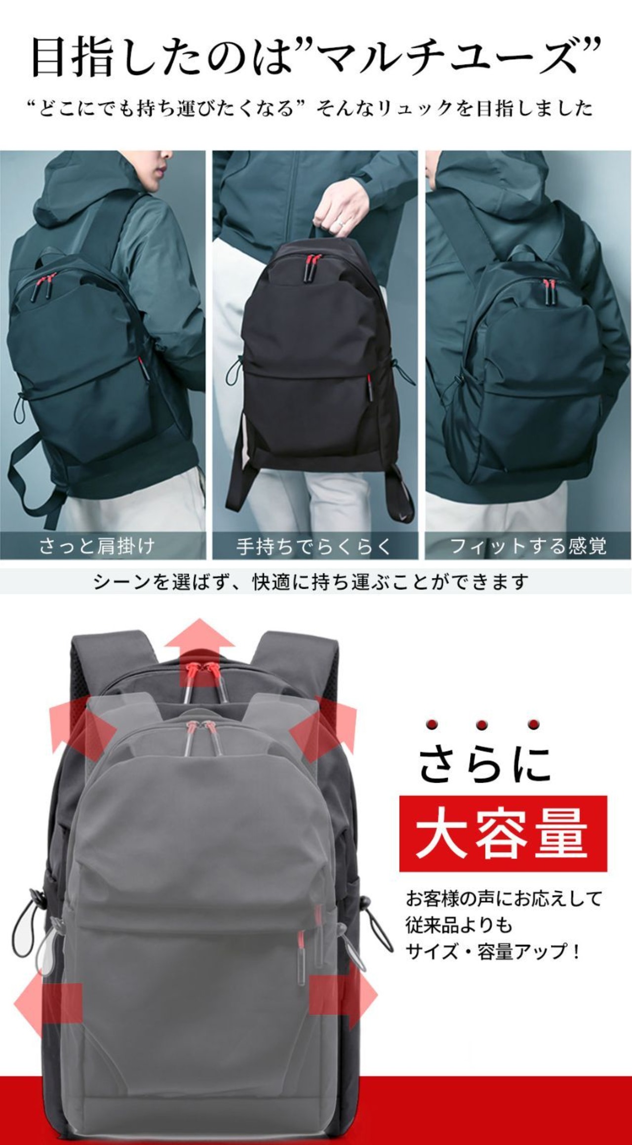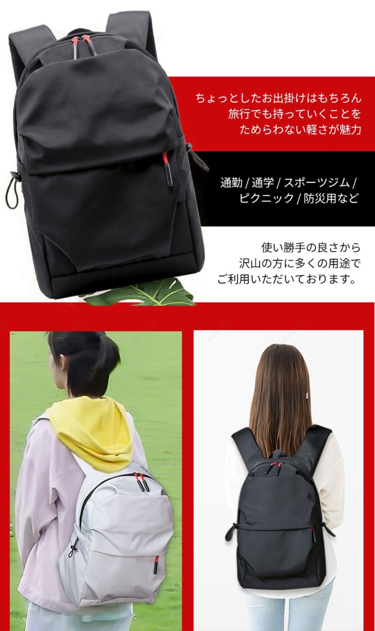 【品 番】xgaz01 【カラー】ブラック、グレー グレー(白に近い淡い灰色です) 【サイズ】 ・約47cm × 32cm × 18cm ※ご購入前に必ずサイズ感をご確認ください。 【特徴】 ※リュックとしての機能を最大限発揮できる大容量でありながらも、背負った姿はカジュアルにバランスよく。多彩なポケットが備わっているので、必要なものを全て入れられる安心感があります。 荷物の整理のしやすさと見た目以上の収納力に、リピーター様から「コスパ最高!」とご好評頂いております。 ※様々なシーンでの使用を想定し、デザインに妥協することなくフォルムの美しさにこだわりました。余計なロゴや刺しゅうは省き、ファスナー持ち手部分に挿し色として赤色を入れることでスタイリッシュな印象に。上品な光沢がある生地は、柔らかで触り心地がよく、幅広い年代の方に受け入れられています。 さらに内側の生地は薄いグレー色のため、イヤホン・Wi-Fiなど黒系ガジェットが迷子になる心配もありません。 ※約500gと軽量化を追求した当製品なら、長時間の持ち運びもストレスフリー。両サイドのポケットに入れた600mlのペットボトル、折り畳み傘は取り出しやすく軽快に。 ※さらに肩紐を約7cmの幅広ワイドパッドにすることで、肩や背中にフィットしながら頸椎にかかる負担を軽減します。 保護性能に優れた生地を採用し、表面には撥水加工を施しています。旅行中など急な雨に降られた時も、さっと水滴を落とすことができ、水の浸透を効果的に防ぎます。防災グッズを入れ災害時持出用リュックとしても使用可能です。 【※注意事項※】 開封時に、生地や素材特有の匂いがすることがございます。予めご了承くださいませ。 匂いが気になる場合、風通しのよい所へ2,3日置いてからご使用ください。 また、使用するにつれて匂いは和らぎますが、匂いに敏感な方はご購入をお控えくださいませ。