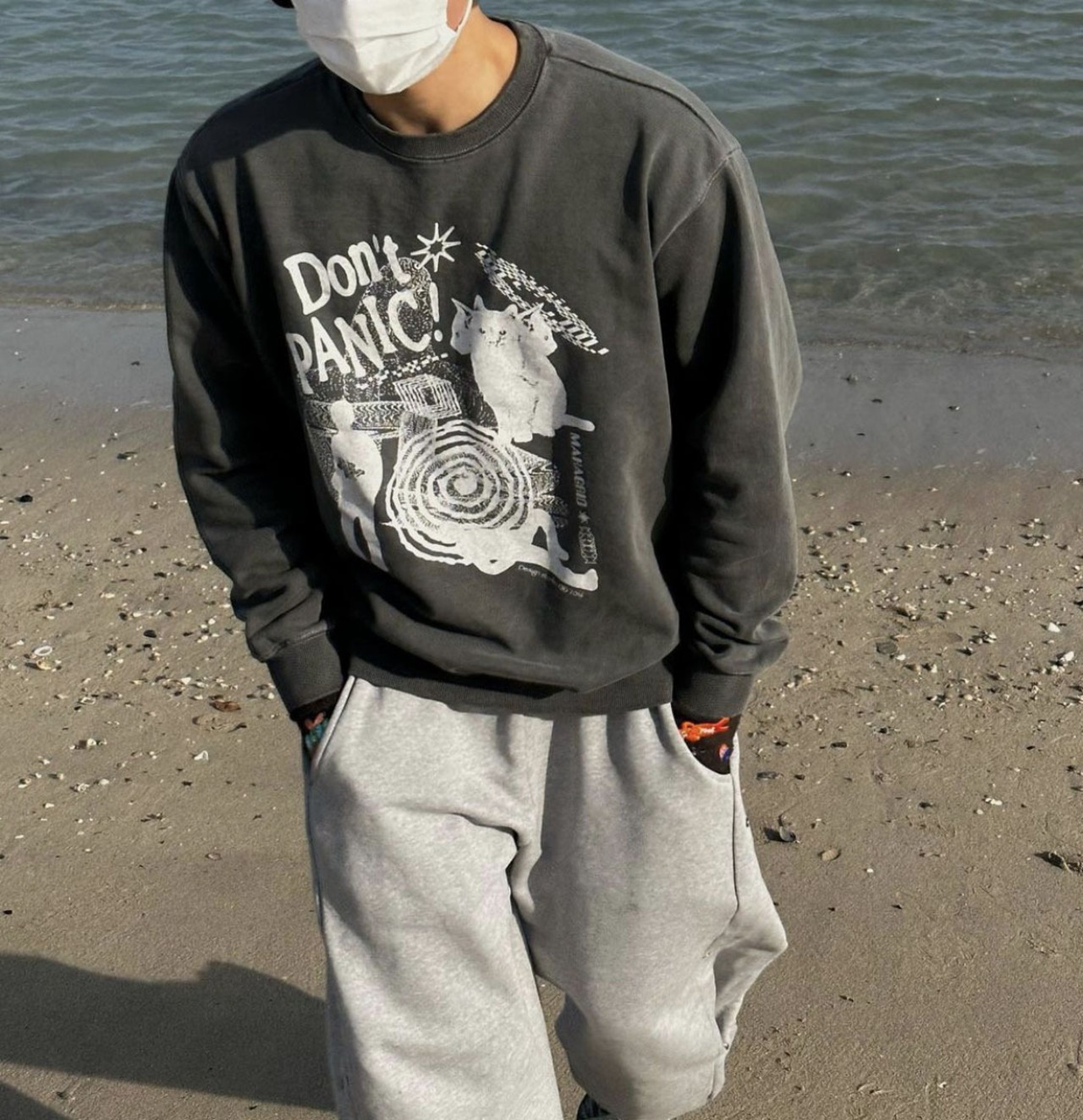 大人気 韓国ファッション mahagrid マハグリッド プルオーバー トップス スウェット 男女兼用 DON’T PANIC PIGMENT SWEATSHIRT CHARCOAL