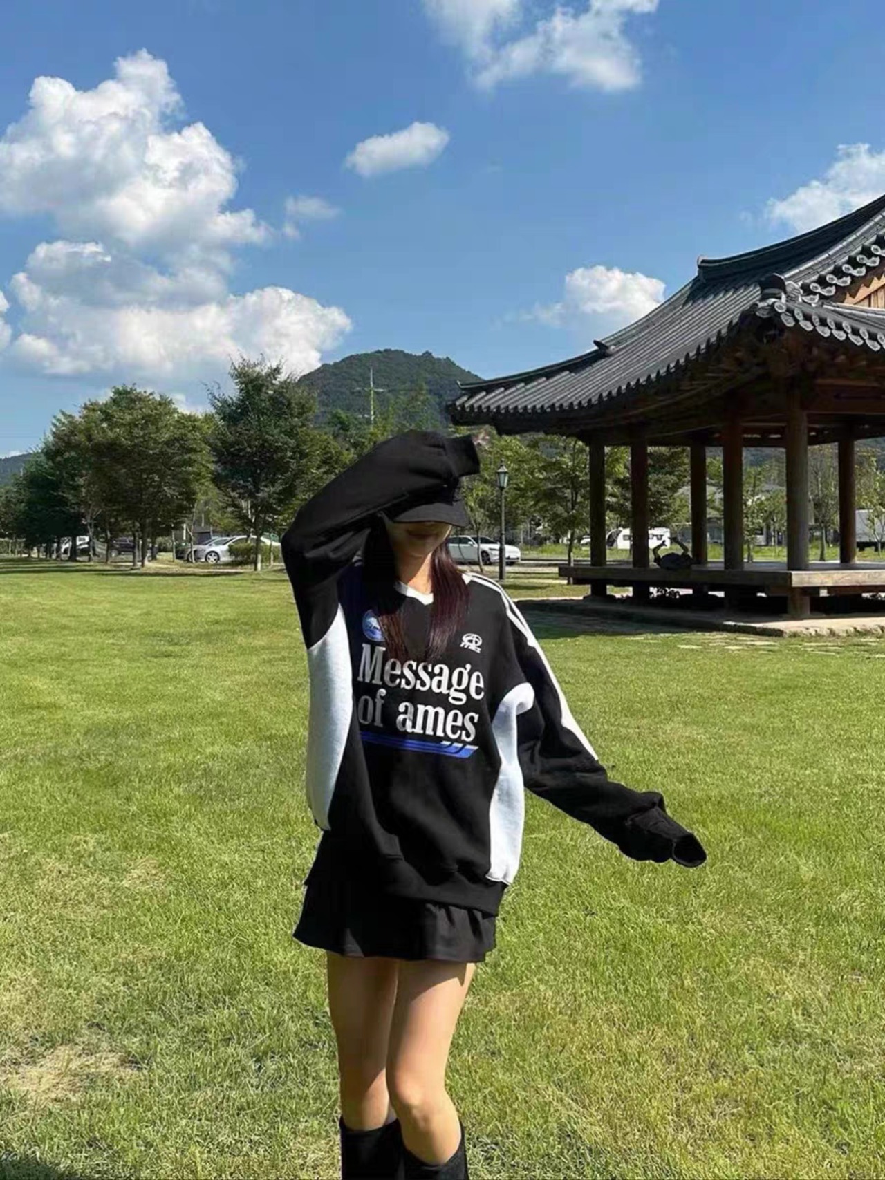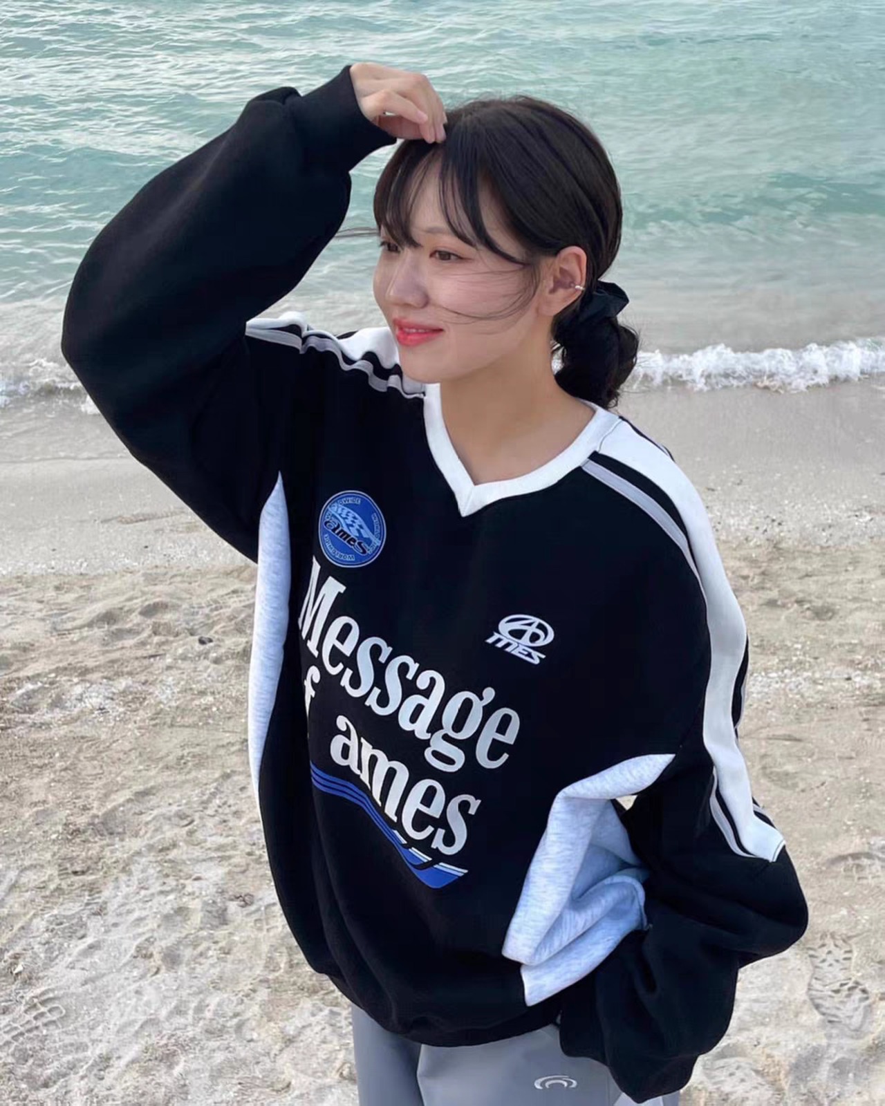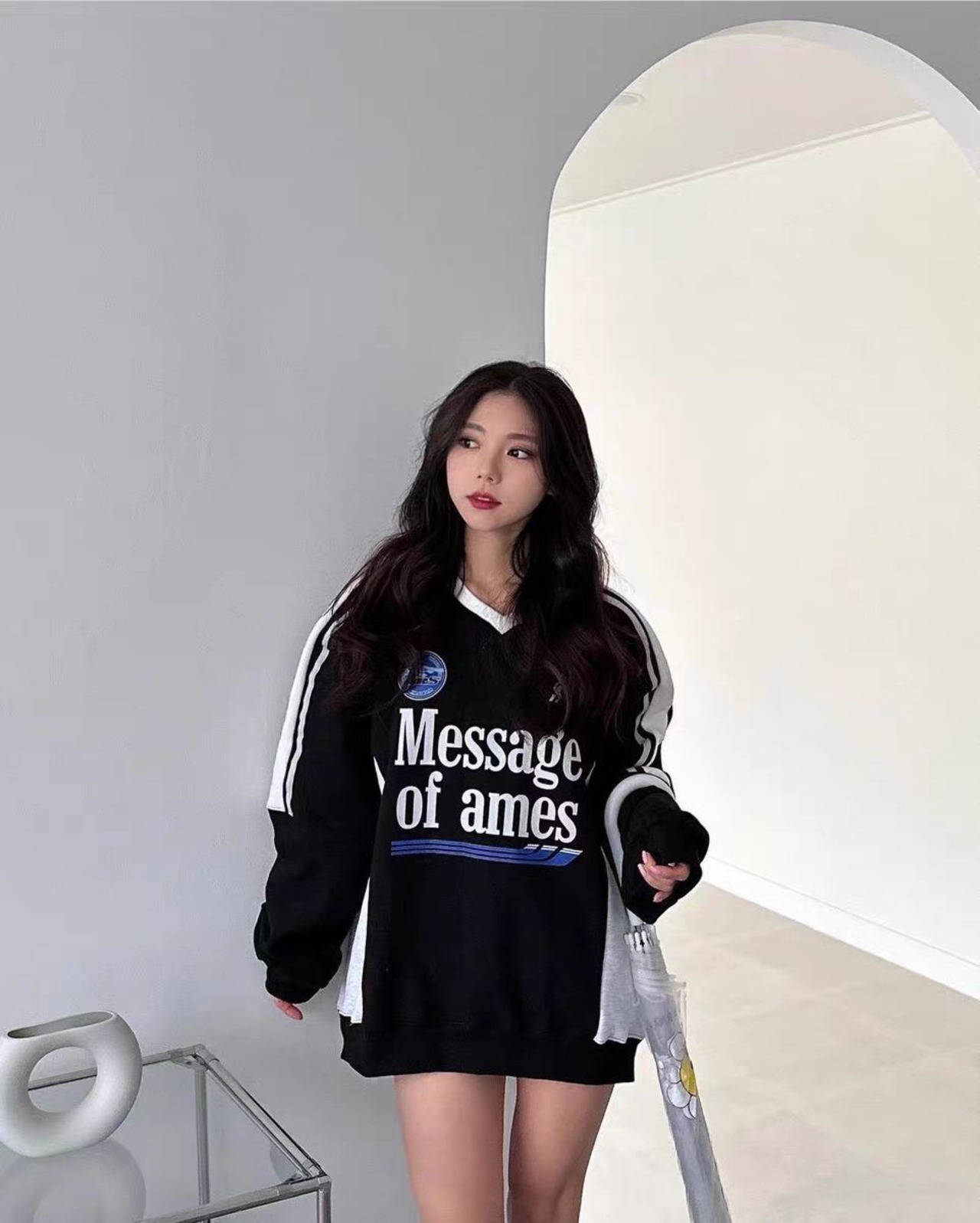 人気 韓国 ファッション SEVENTEENジョンハン着用 長袖 男女兼用 AMES-WORLDWIDE アメスワールドワイド Vネックユニフォームスウェット ブラック