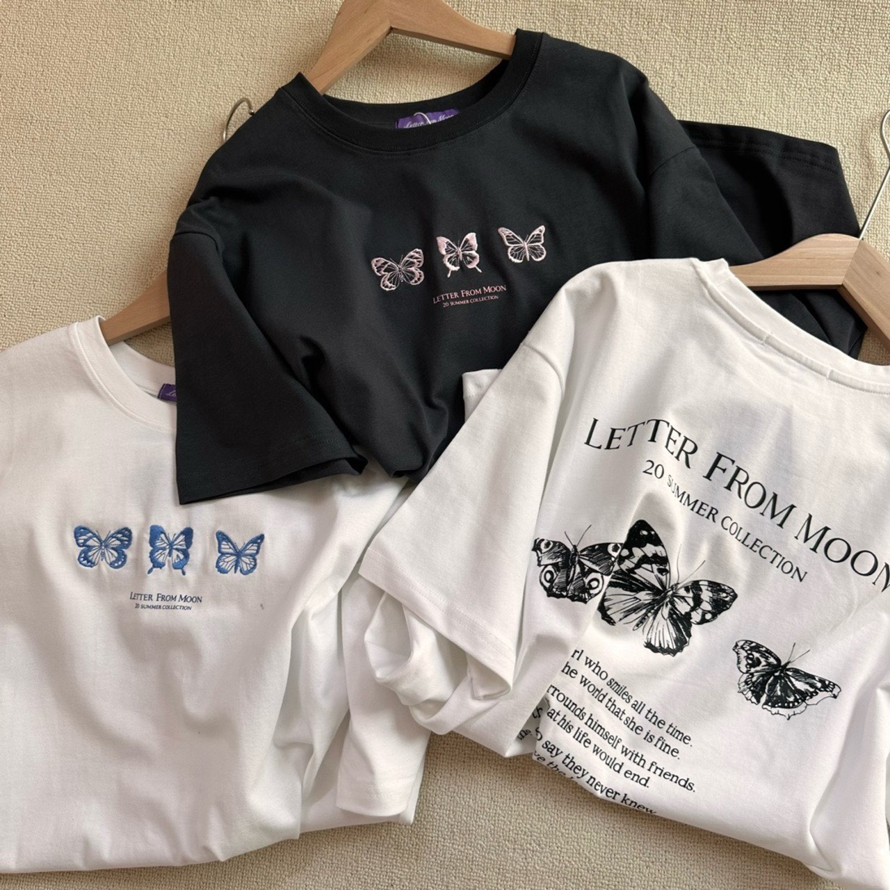 韓国 LETTER FROM MOON ニュートリプルバタフライ刺繍Tシャツ NEW VER.Triple Butterfly Embroidery T-Shirt 半袖