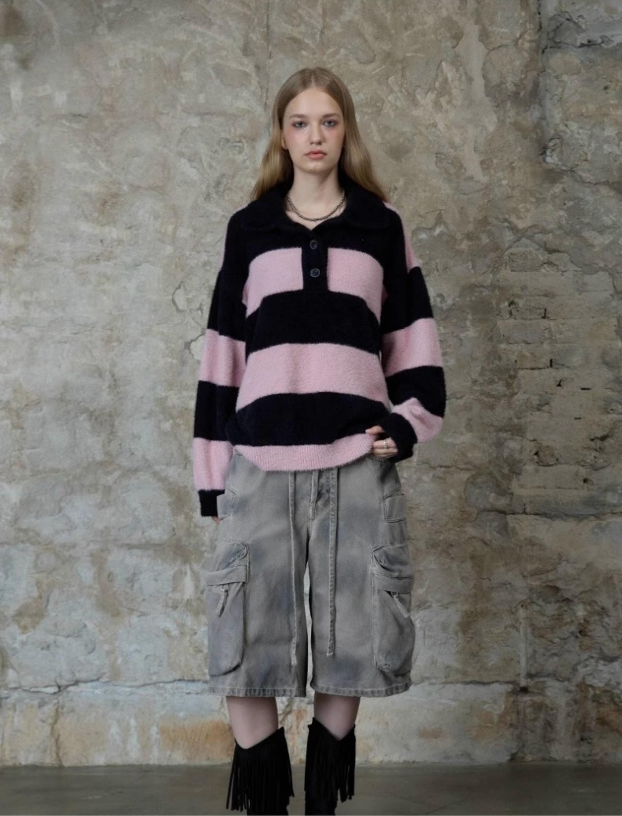 新作 韓国ファッション LARTIGENT ラーティゼン ジェニー着用 レディース トップス ニット セーター 長袖 L13 RUGBY BOLD KNIT PINK