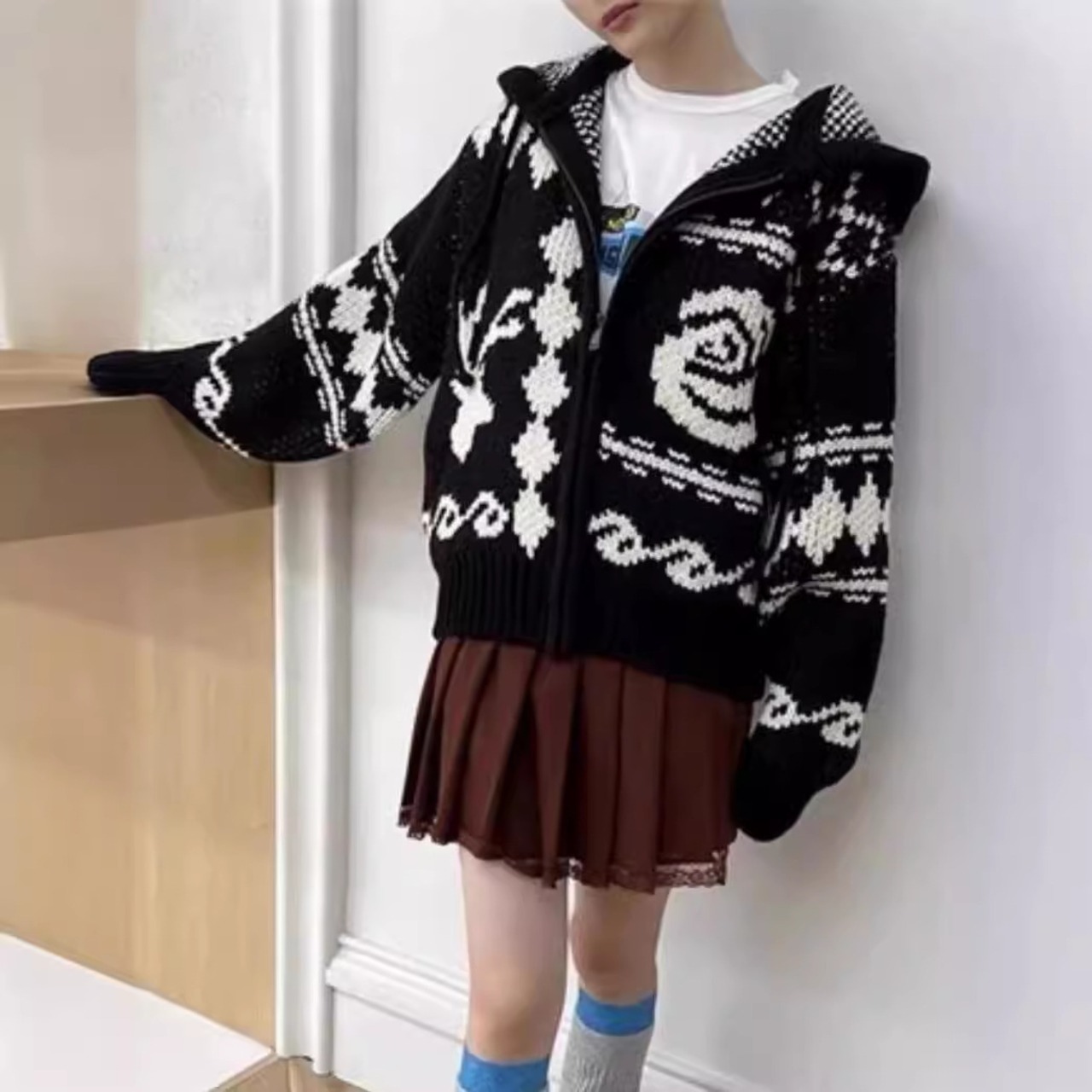 大人気 韓国ファッション OPEN YY_TheOpen Product オープンワイワイ_ザオープンプロダクト アウター ジャケット レディース ROSE & DEER JACQUARD KNIT JACKET BLACK