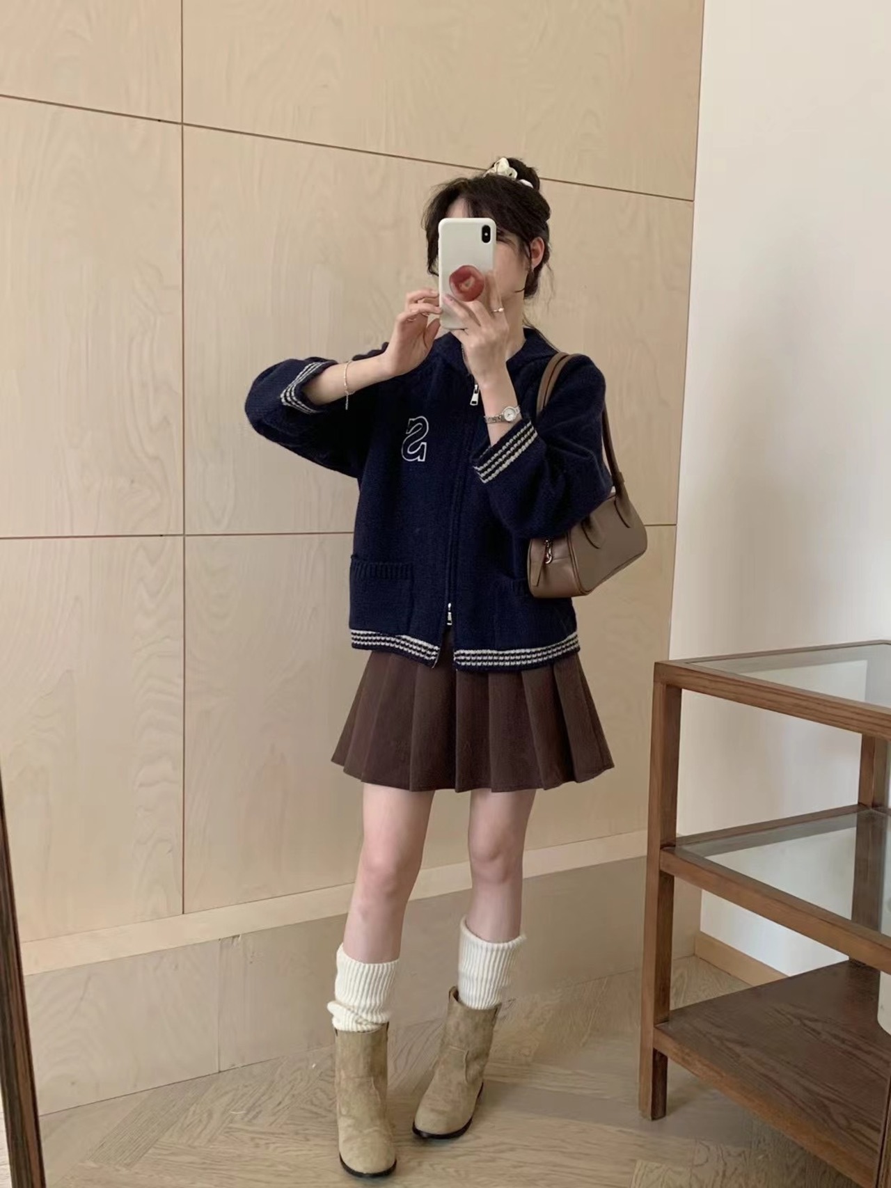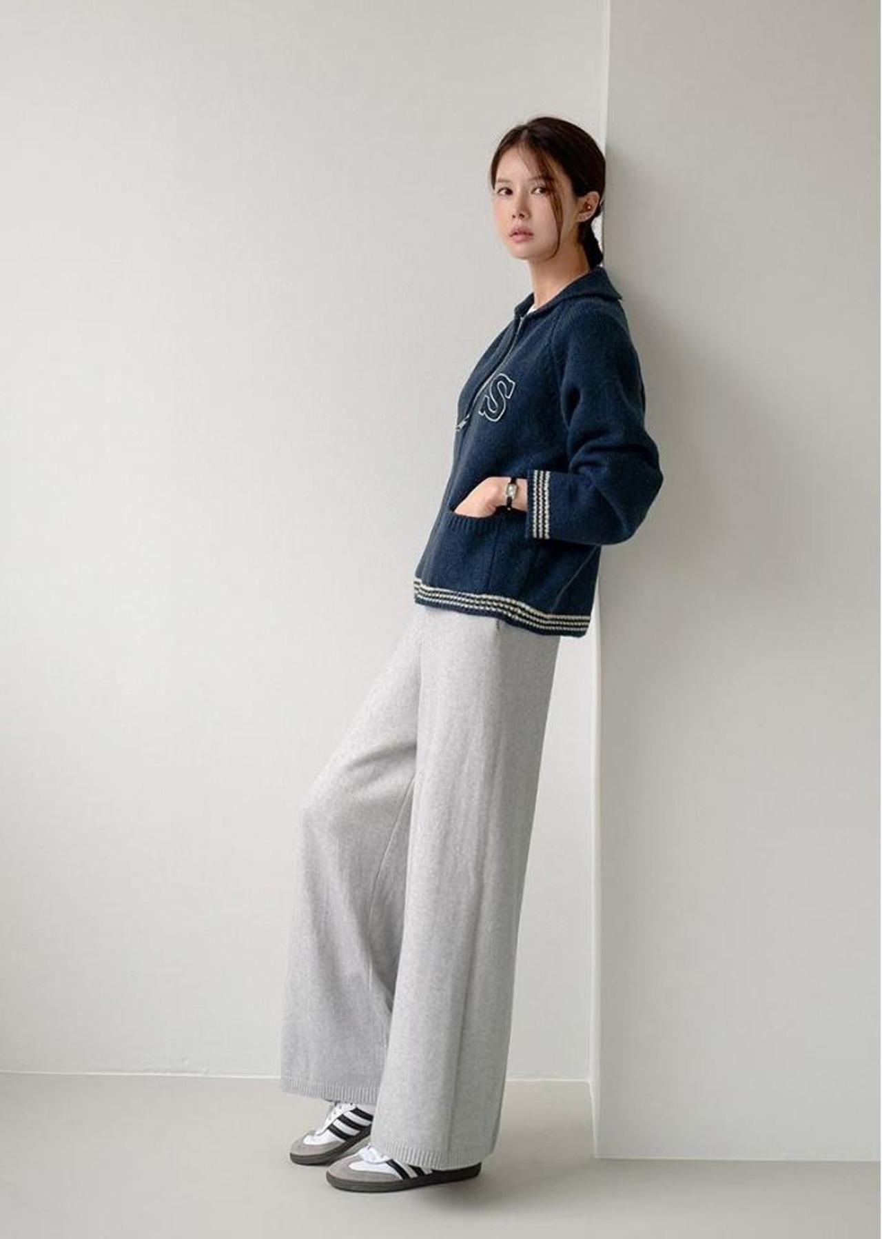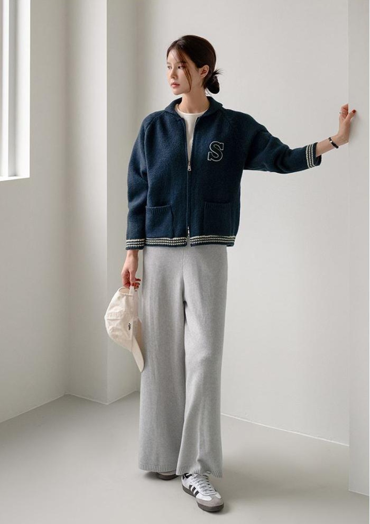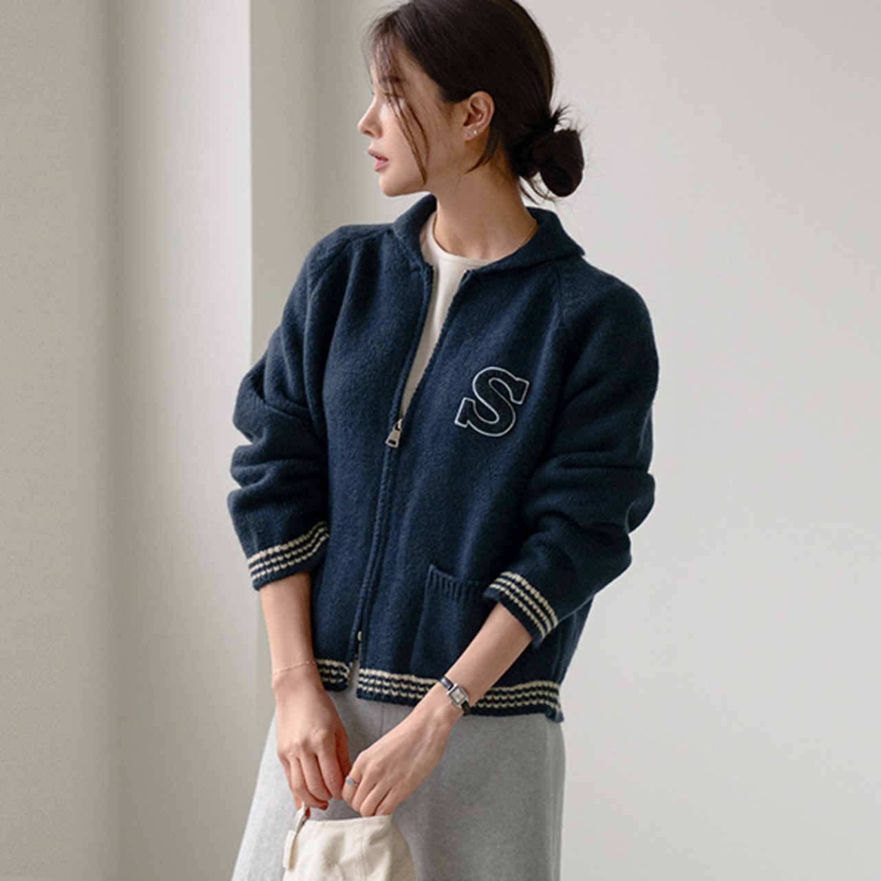 韓国ファッション Sienne シエンヌ レディース カーディガン ジャガードニット 襟付カーディガン ニットジャケット ネイビー