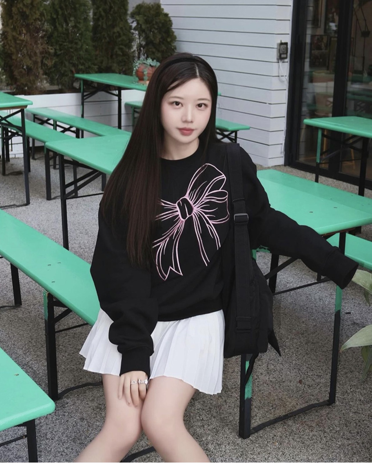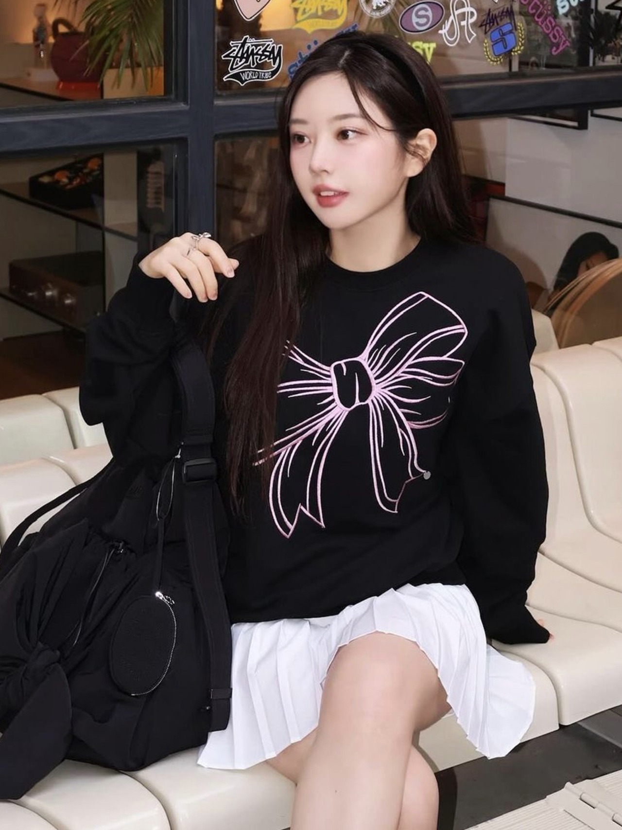 韓国 RONRON ロンロン レディース ファッション トップス 長袖 スウェット ビッグリボンラインスウェット BIG RIBBON LINE SWEATSHIRT ブラック