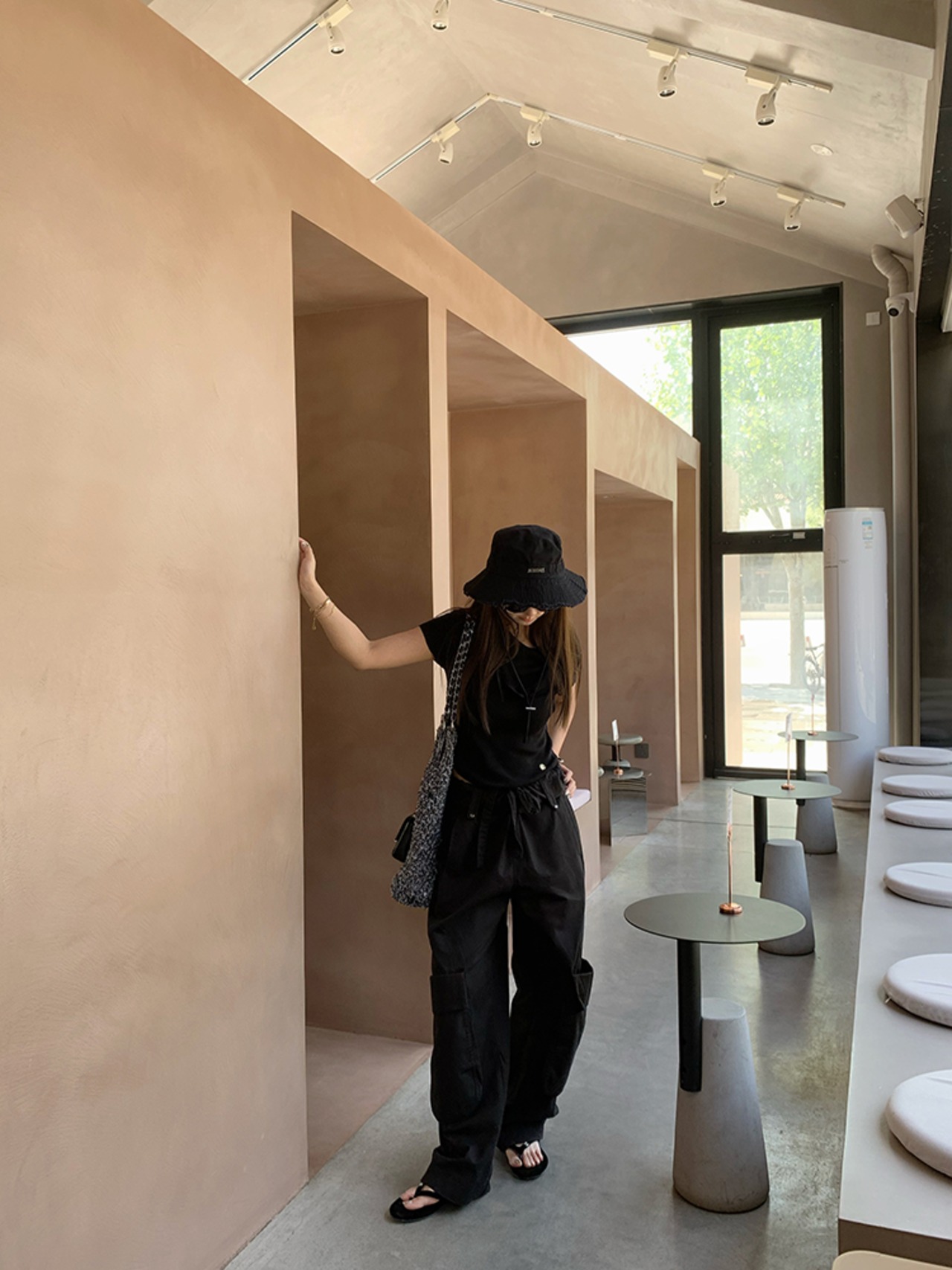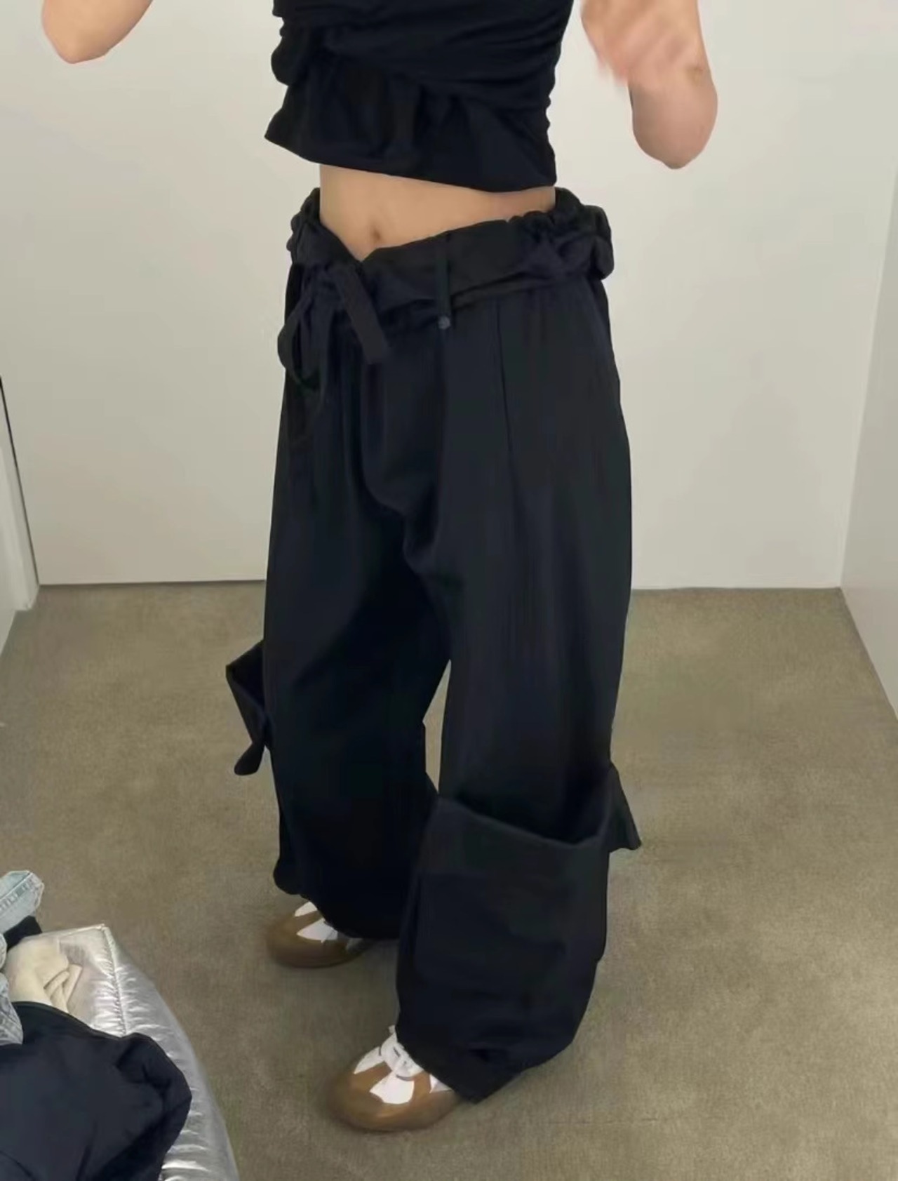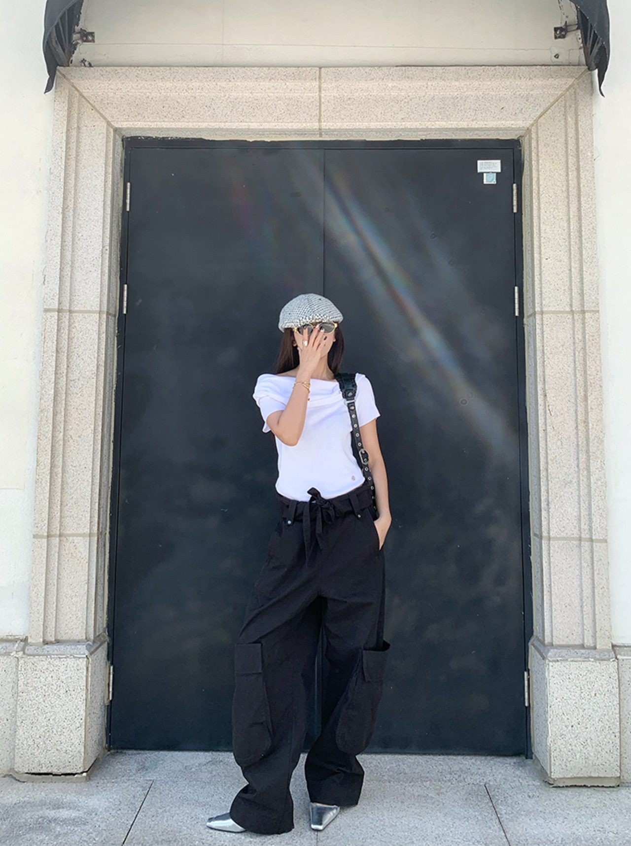 韓国ファッション OPEN YY オープンワイワイ レディース トレーニングパンツ パンツ カーゴパンツ ROLLED WAIST CARGO PANT.S BLACK